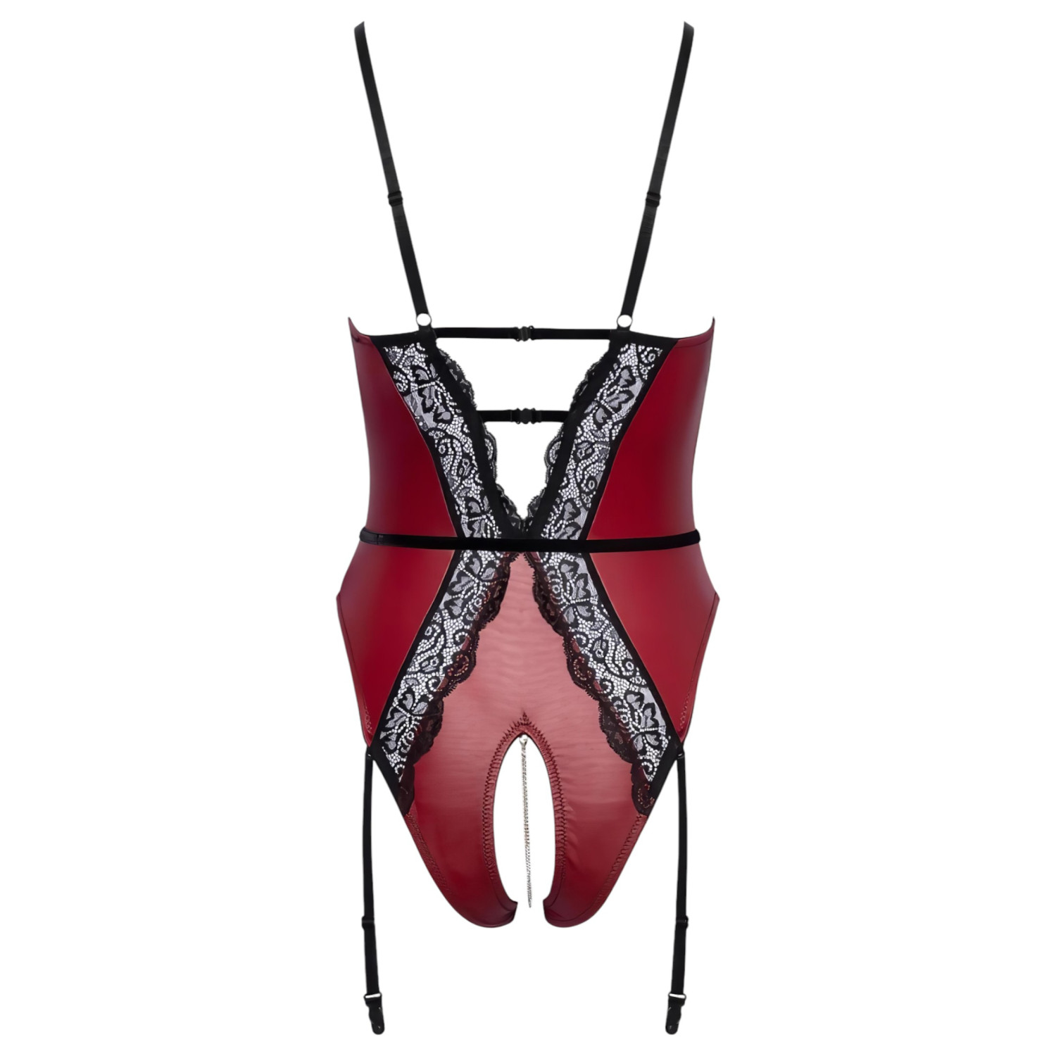 Det forførende samspillet mellom rødt og svart gjør denne åpne bodyen uimotståelig med sine strassdetaljer – Abierta Fina åpen body med kjededetaljer