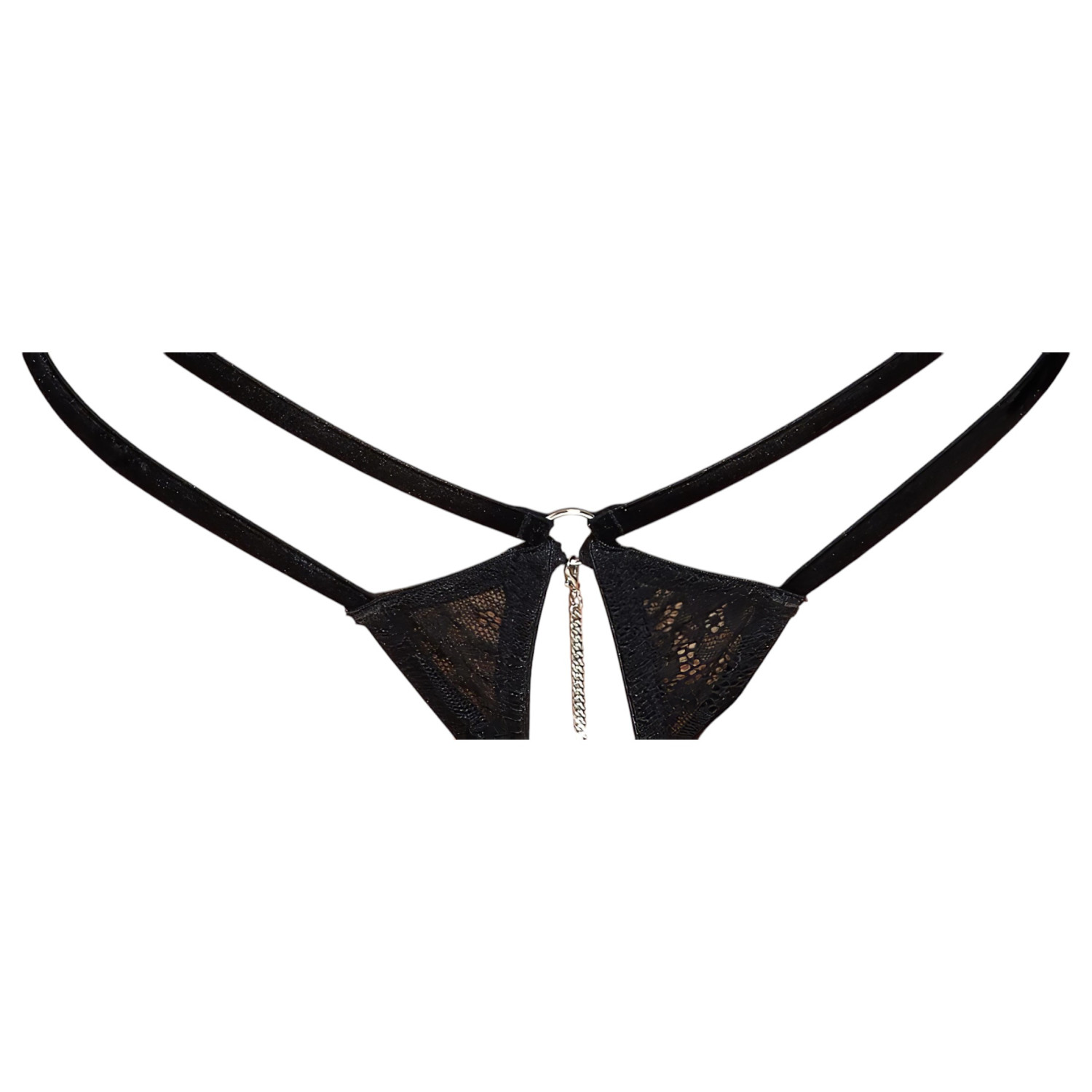 • Spennende detaljer - glidelås-korsett, åpen truse-design og glitrende kjetting.