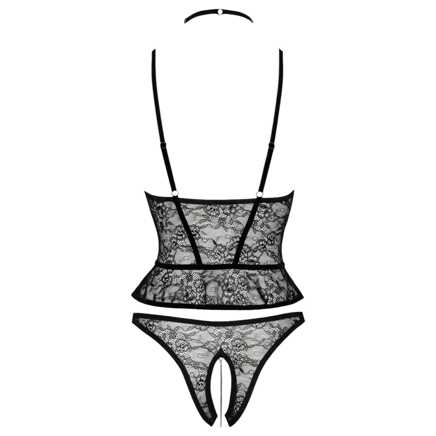 Dette unike settet kombinerer romantisk blonde-eleganse med dristige, erotiske detaljer. Det åpnende korsettet og den frekke, kjetting-pyntede trusen er et uforglemmelig valg for enhver anledning.