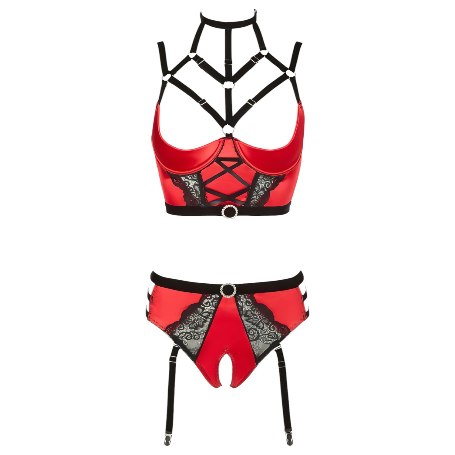 Den bystøttede, lett polstrede bh-en løfter bysten og former en vakker utringning, mens den åpne underdelen kan bæres under akten. De spesielle stroppedetaljene, den glitrende strassen og metallringene skaper en forførende, men likevel elegant effekt. Dette settet er den perfekte kombinasjonen av selvtillit og sensualitet.