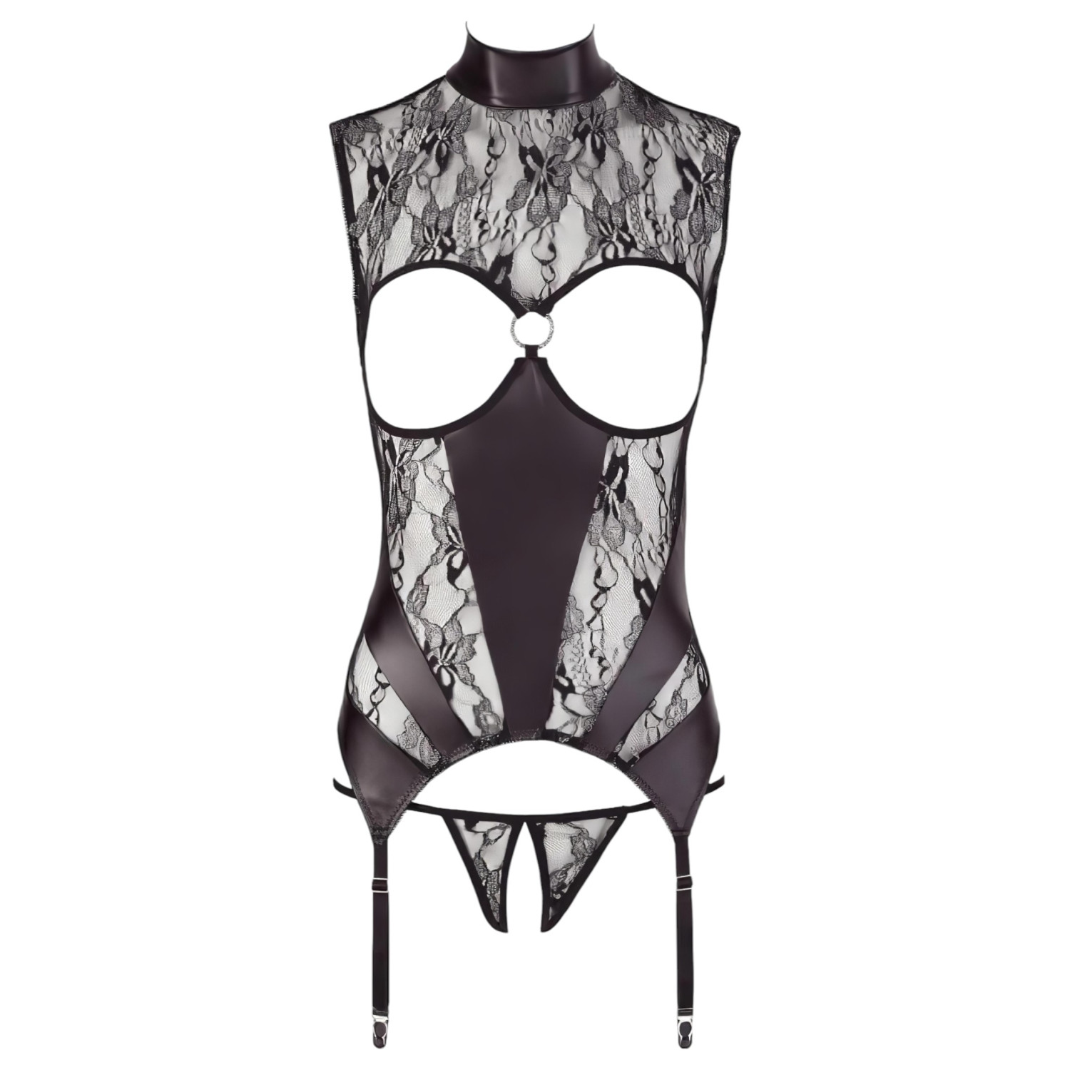 Den åpne bh-delen gir et utfordrende og sensuelt utseende, mens den ståkragen utstråler eleganse og raffinement. Den store rhinestone-ringen gir et unikt og spennende visuelt element, og de justerbare strømpeholderstroppene sørger for tilpasset passform. Settet inkluderer truser med åpen skritt som øker forførelseskraften.