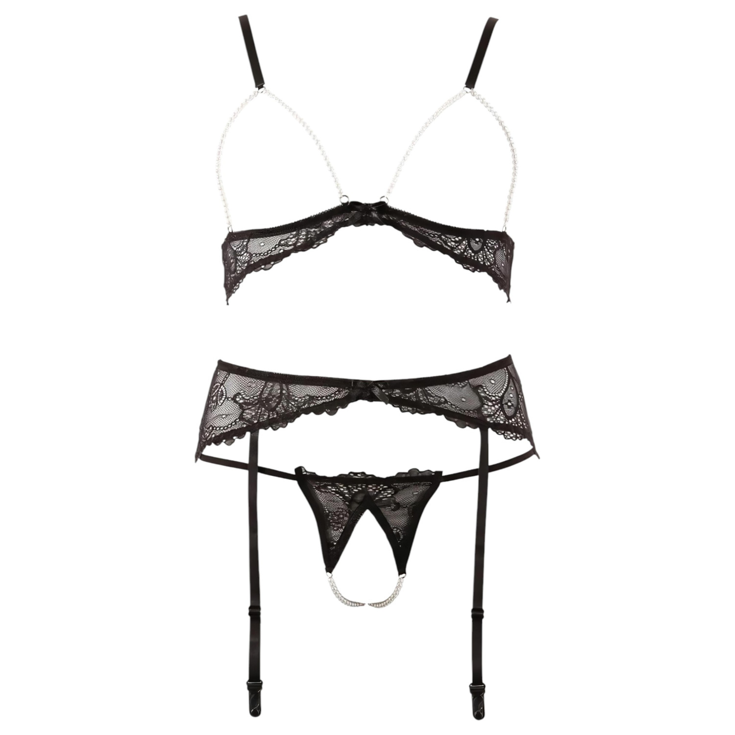 Kombinasjonen av sexy blonder og perledetaljer gir både eleganse og utfordring. Justerbare stropper på BH og strømpeholder sikrer at det passer perfekt til kroppen din, mens den åpne trusen garanterer maksimal forførelse. Dette settet er ikke bare undertøy - det er en sanselig opplevelse som fremhever din femininitet og styrker selvtilliten din.