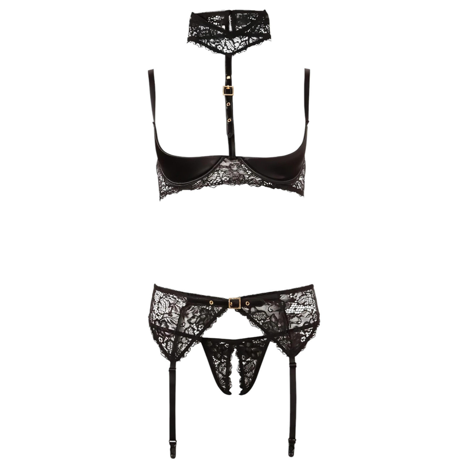 • Kombinasjon av elegant blonder og fetish-stil stropper.
