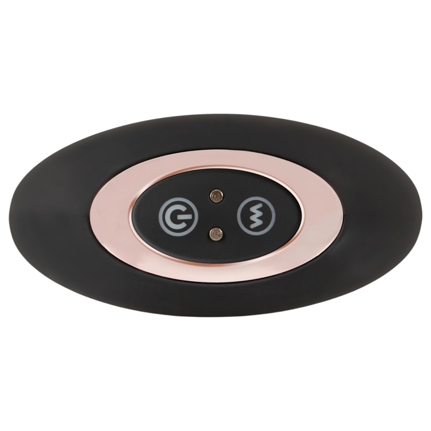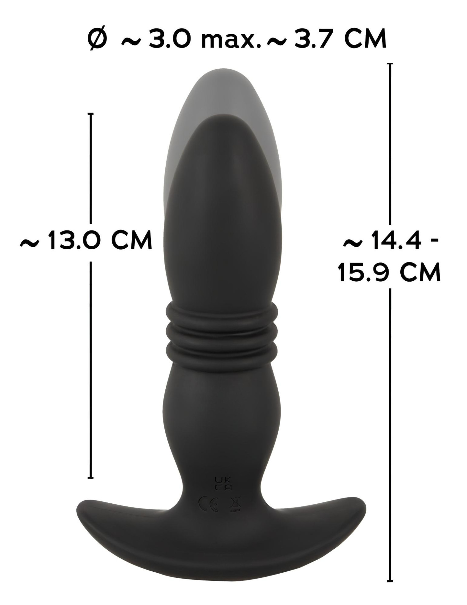 Smør både anus og vibratoren med glidemiddel. Plasser vibratoren forsiktig med den koniske tuppen først. Slå på enheten ved å trykke på knappen, og velg ønsket vibrasjons- eller støtemodus med fjernkontrollen. Nyt intense støt- og vibrasjonsopplevelser!