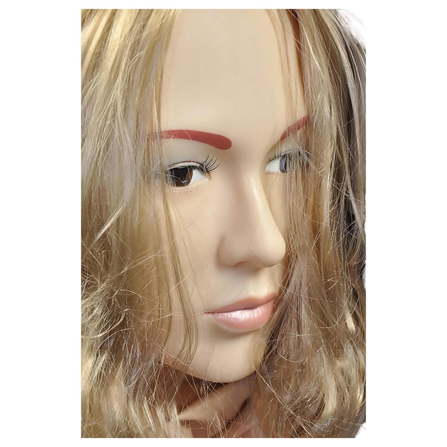 • 3D ansiktsdesign, langt blondt hår, sensuelle lepper, brune øyne, forlokkende øyenvipper og fyldige bryster for autentisk utseende