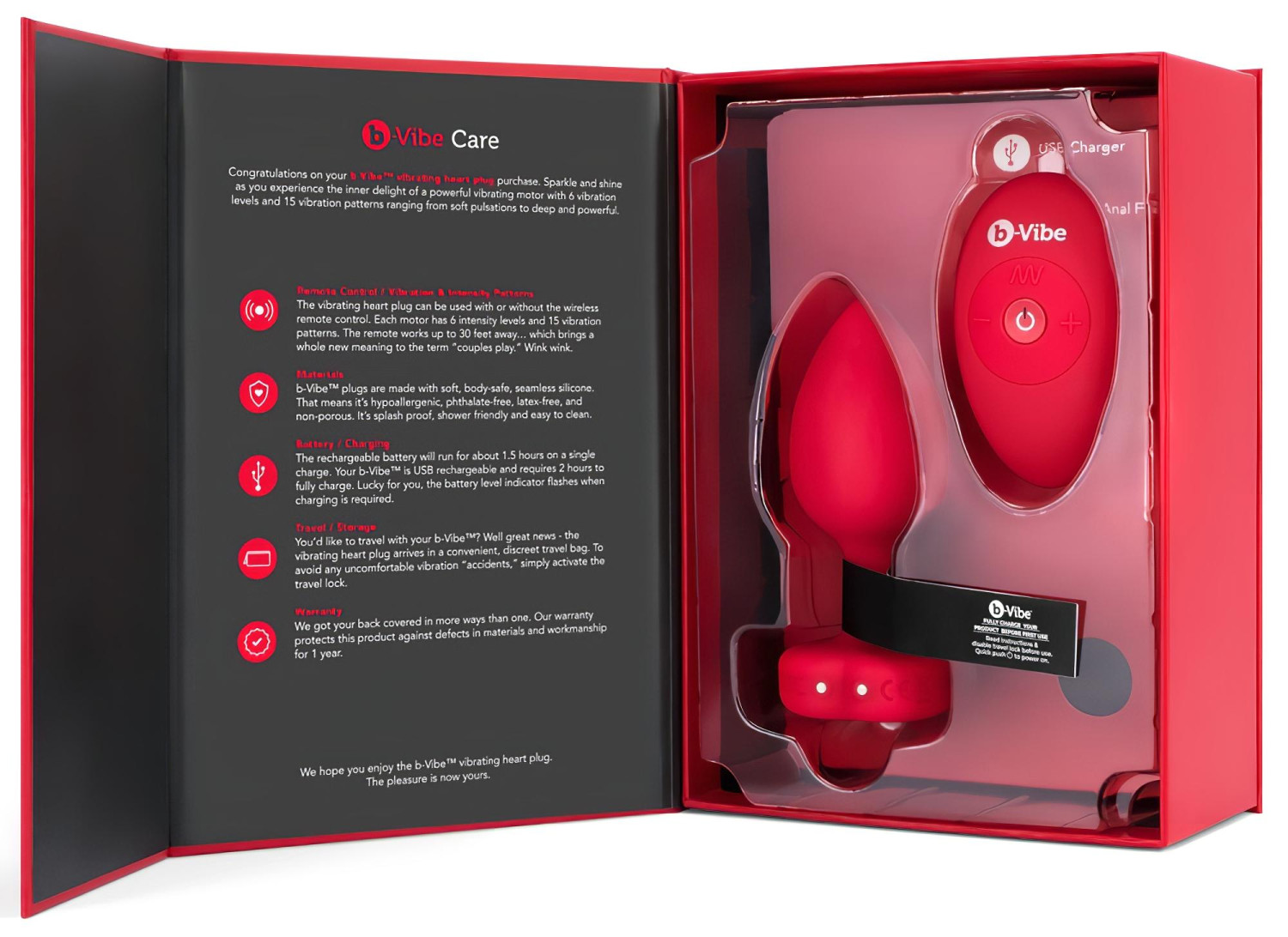 b-vibe hjerte - oppladbar, trådløs anal vibrator (rød)