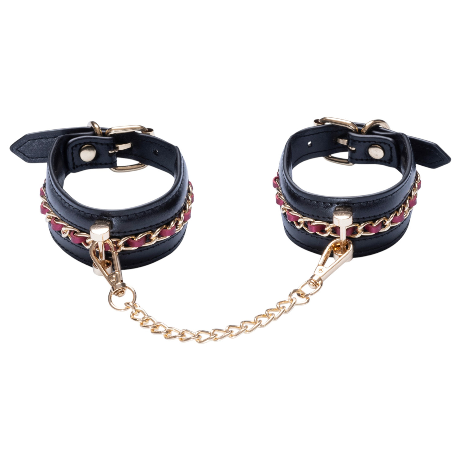 Dette settet inneholder alt du trenger for et spennende bondage-lek. Det svarte kunstlæret med gulldetaljer og røde innslag gir et elegant, men provoserende utseende. Med de ulike elementene kan du enkelt kombinere og skape nye opplevelser. De komfortable stroppene og mansjettene er justerbare, og gir både sikker og komfortabel bruk.