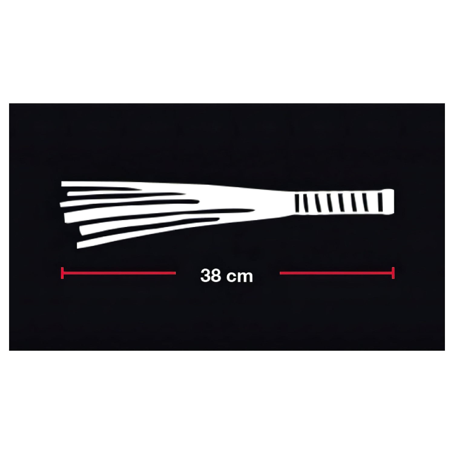 En fargerik og livlig pisk laget av ekte semsket skinn, med et stripete håndtak. Det har en sterk og stiv håndtak hvor fargerike og svarte striper løper langs. Den har et praktisk grep i enden. Total lengde er 38 cm.