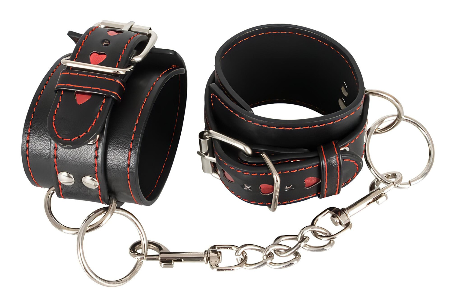 Håndjern av høy kvalitet i slitesterkt kunstskinn, dekorert med glitrende hjertemotiver og rød søm. Utstyrt med D-ringer i metall.