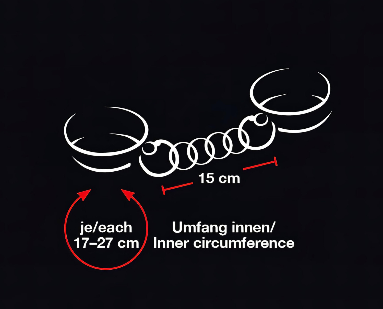 • Størrelsen på håndjernene kan justeres med metallspenne: 17-27cm
