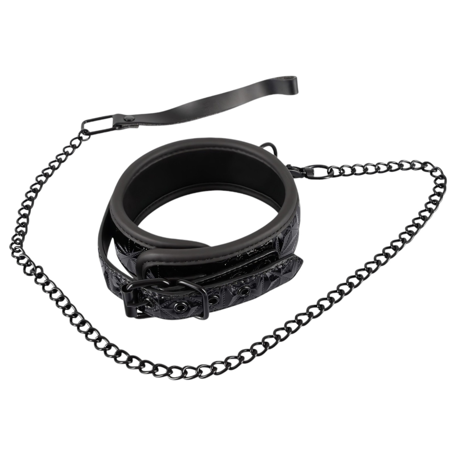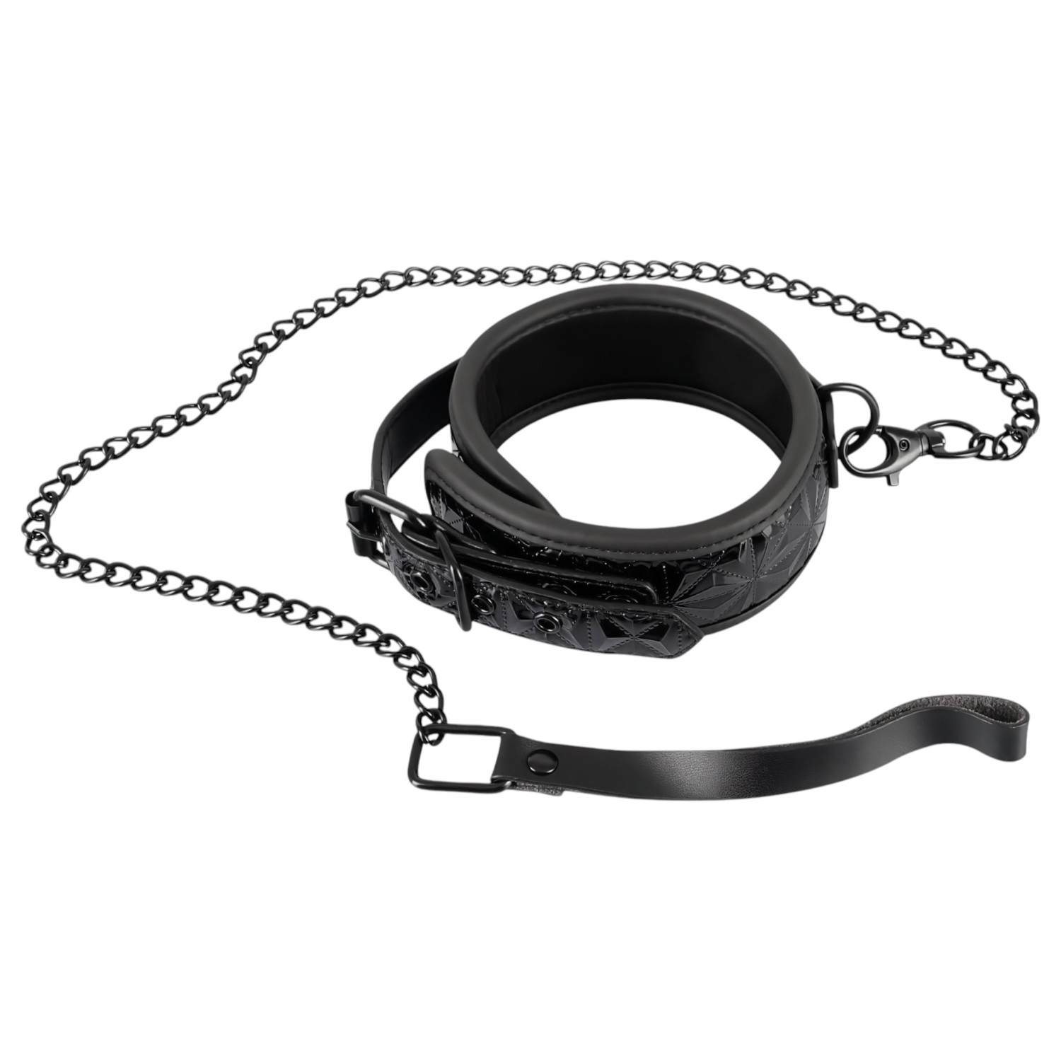 Ta dominans- og underkastelsesspillene til et nytt nivå med dette elegante, diamantmønstrede, polstrede halsbåndet og den tilhørende kjede-leashen. Det sorte, lett polstrede halsbåndet har en preget overflate og avrundede kanter, som sikrer både komfort og stil.