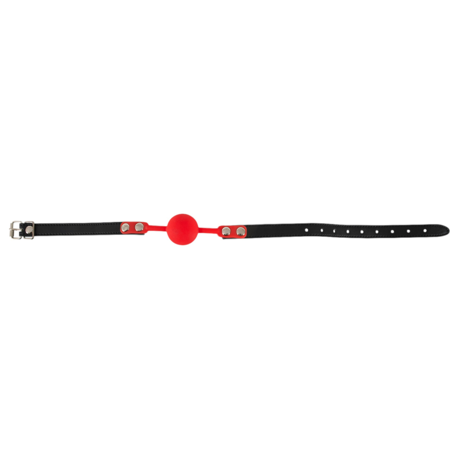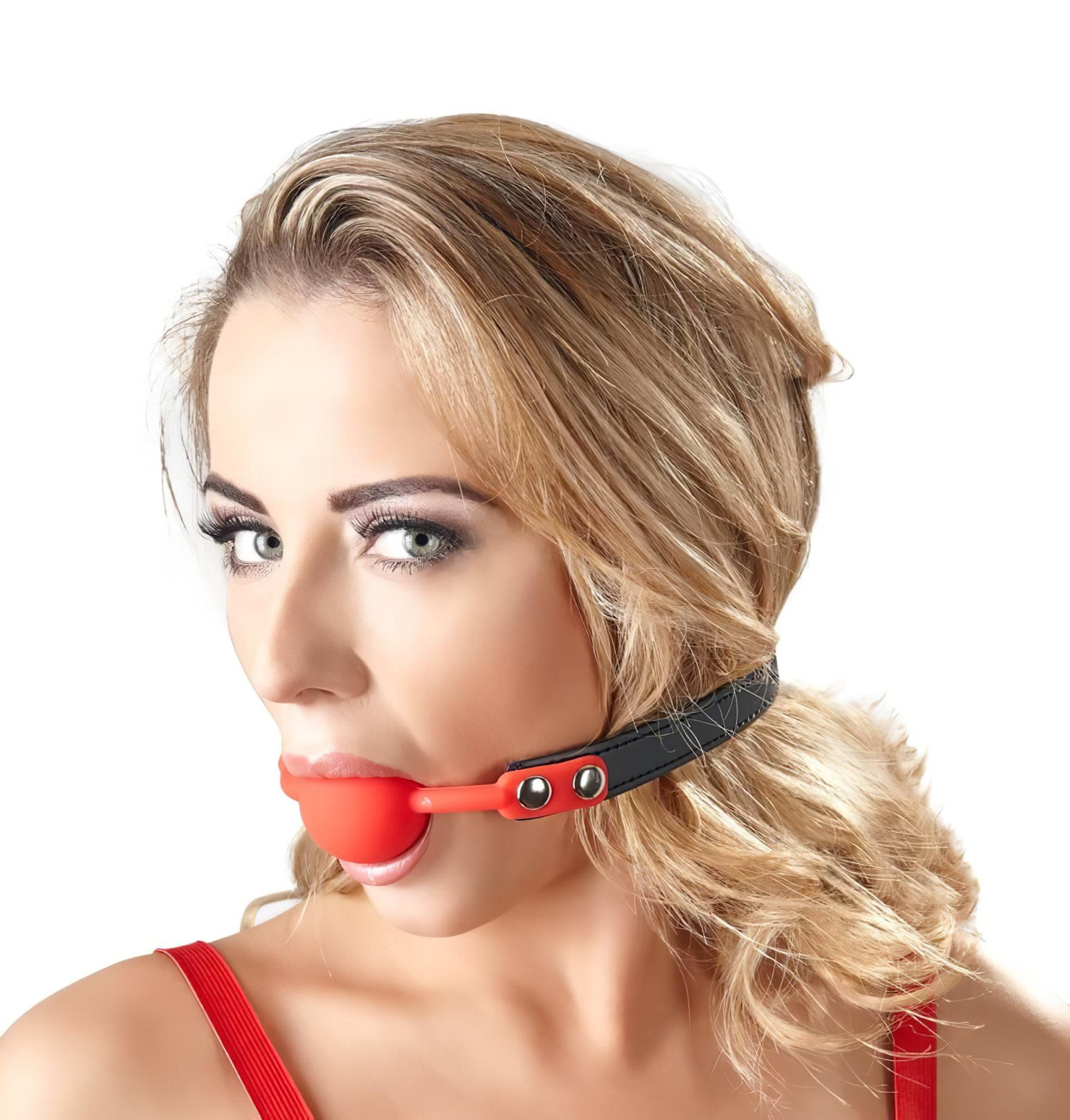 • 1 rød silikon munnpropp med svart imitert skinnstropp og metallspenne.
