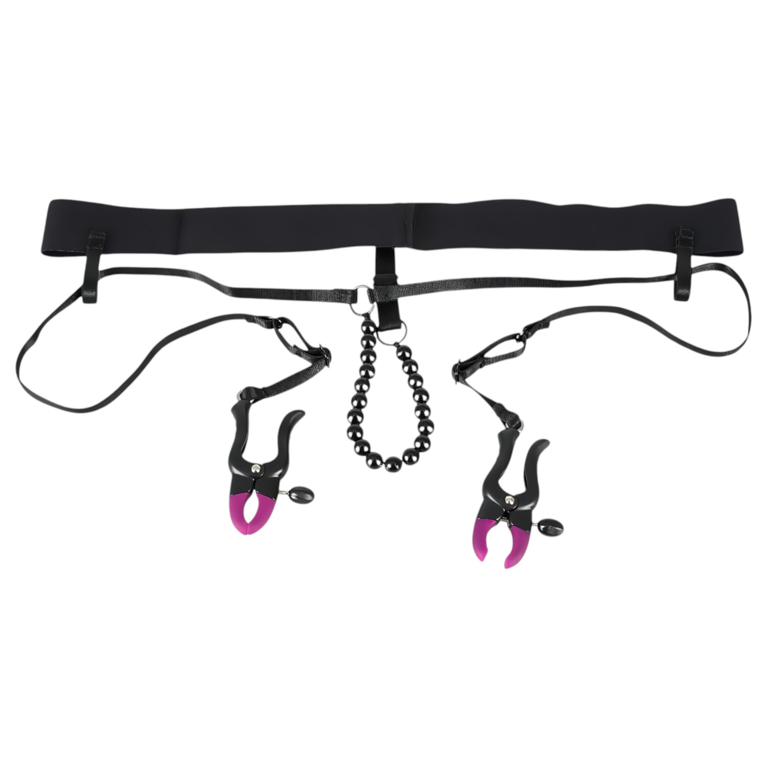 Oppdag et nytt nivå av nytelse med denne svarte spredningsstroppen, utstyrt med leppespredere og stimulerende perler for klitoris. Intensiteten på sprederne kan enkelt justeres med justeringsskruene, mens den fleksible og justerbare stroppen sikrer en komfortabel og sikker passform.
