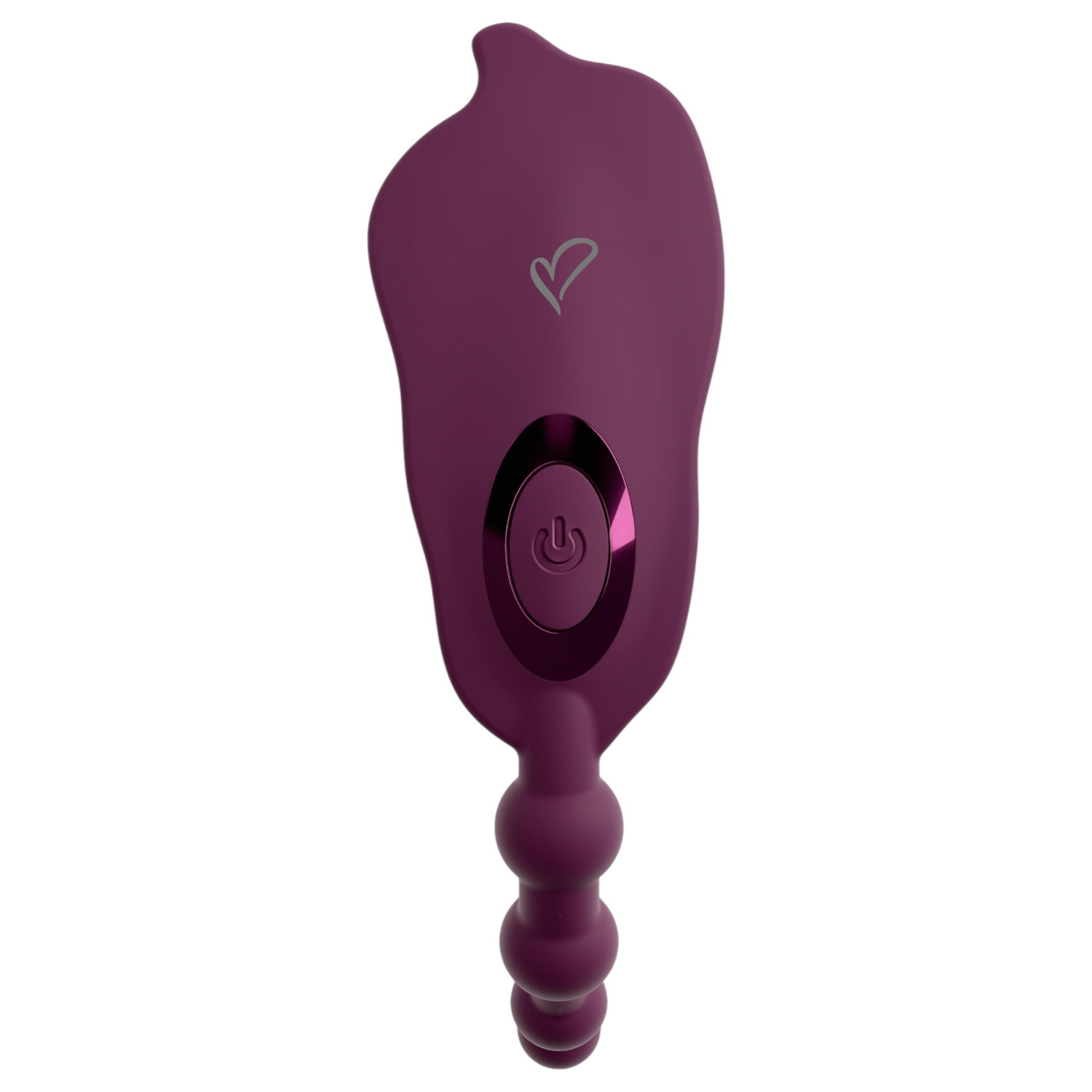 Plasser trusevibratoren i undertøyet eller direkte på kroppen. Den større, runde delen rettes mot vagina, og den lille prikkete øvre delen trykker mot klitoris. Den fleksible perleremmen stimulerer perineum-/anusområdet. Velg ønsket vibrasjonsmodus med fjernkontrollen eller enhetsknappen.