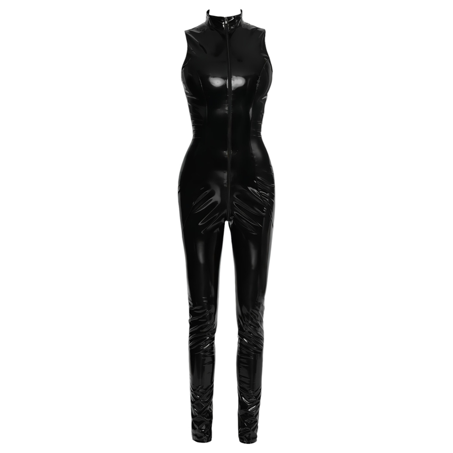 Oppdag en ny dimensjon av forførelse med denne fantastiske, ermeløse, svarte vinil jumpsuiten som følger kroppens kurver perfekt og fremhever de feminine formene dine.