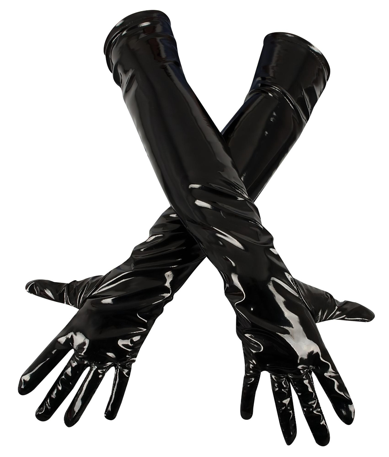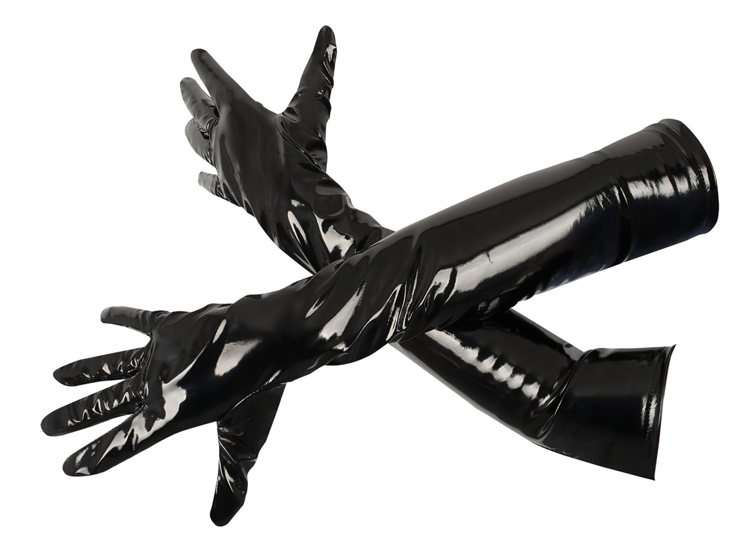 Skinnende hansker laget av lakk, perfekte som tilbehør til ville fester eller som en del av et dominakostyme!