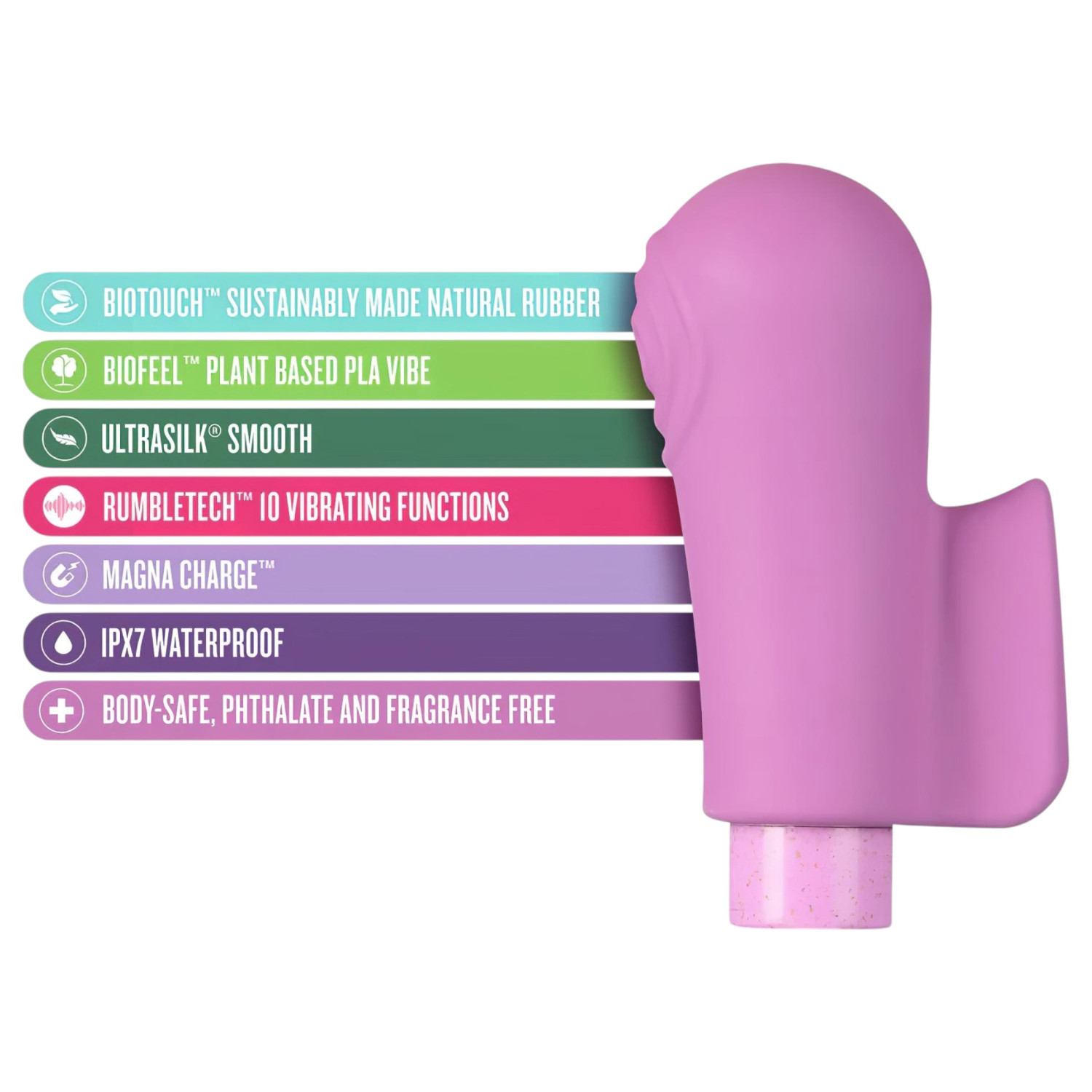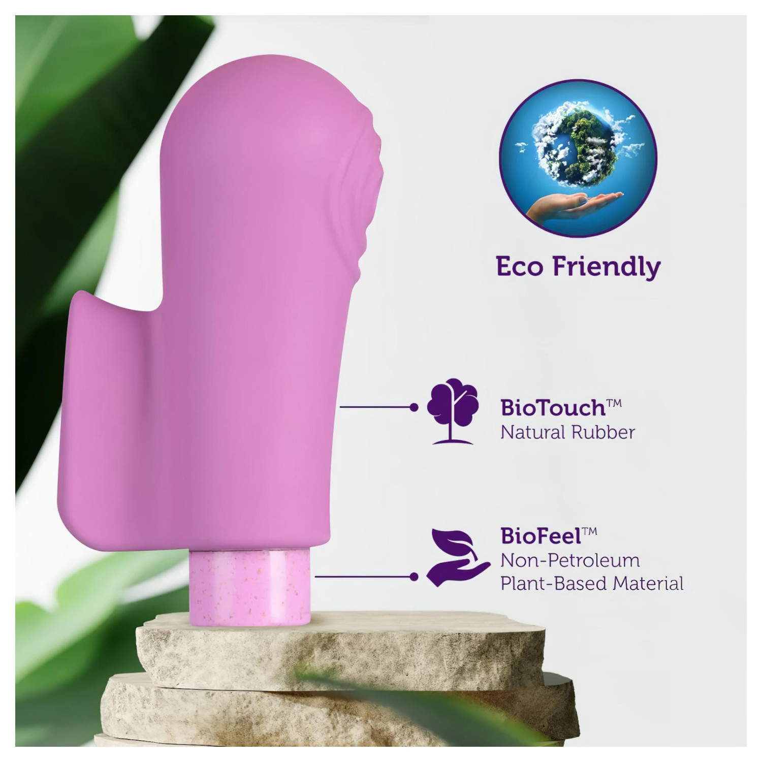 Blush Gaia handler ikke bare om nytelse, men også om respekt for miljøet. Denne økologisk bevisste fingervibratoren er laget av plantebasert bioplast (BioFeel™) og naturlig gummi (BioTouch™), som er ansvarlig samlet inn uten latex. Hvis du ønsker nytelse og bevissthet samtidig, er denne vibratoren laget for deg!