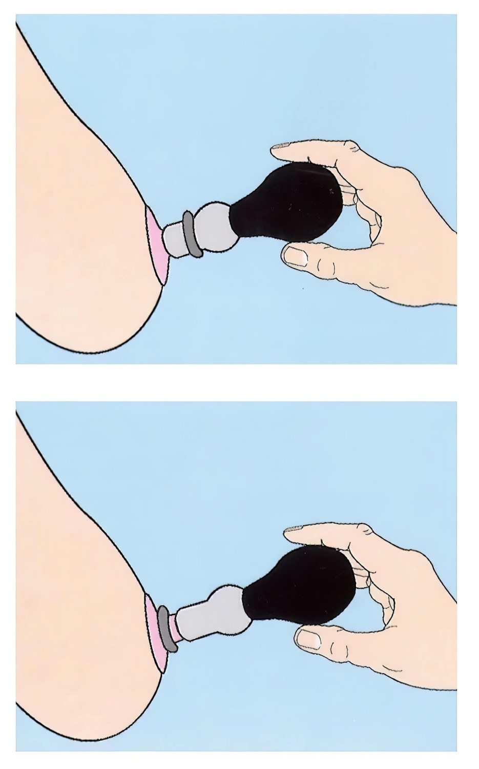 • Fjern klokkene ved å klemme dem litt sammen igjen for å oppheve vakuumet. Mens vakumet suger brystvorten din, rull ned festeringen som er plassert på forhånd, så opprettholder du fastheten i brystvorten.
