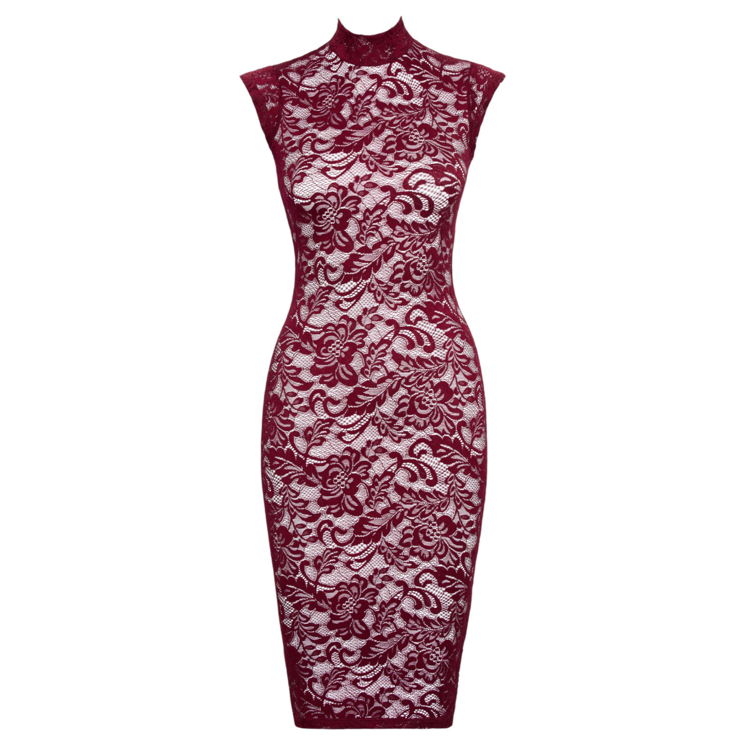 Denne ermeløse kjolen, som rekker til knærne, er laget av spesialdesignet Bordeaux rød blonde, som forsiktig følger kroppens kurver og fremhever den feminine silhuetten. Det myke, fleksible materialet gir komfortabel bevegelse og perfekt passform, noe som gjør den ideell for romantiske kvelder, forførelse eller som elegant undertøy. En knappelukking bak kragen gir en ekstra touch av eksklusivitet.