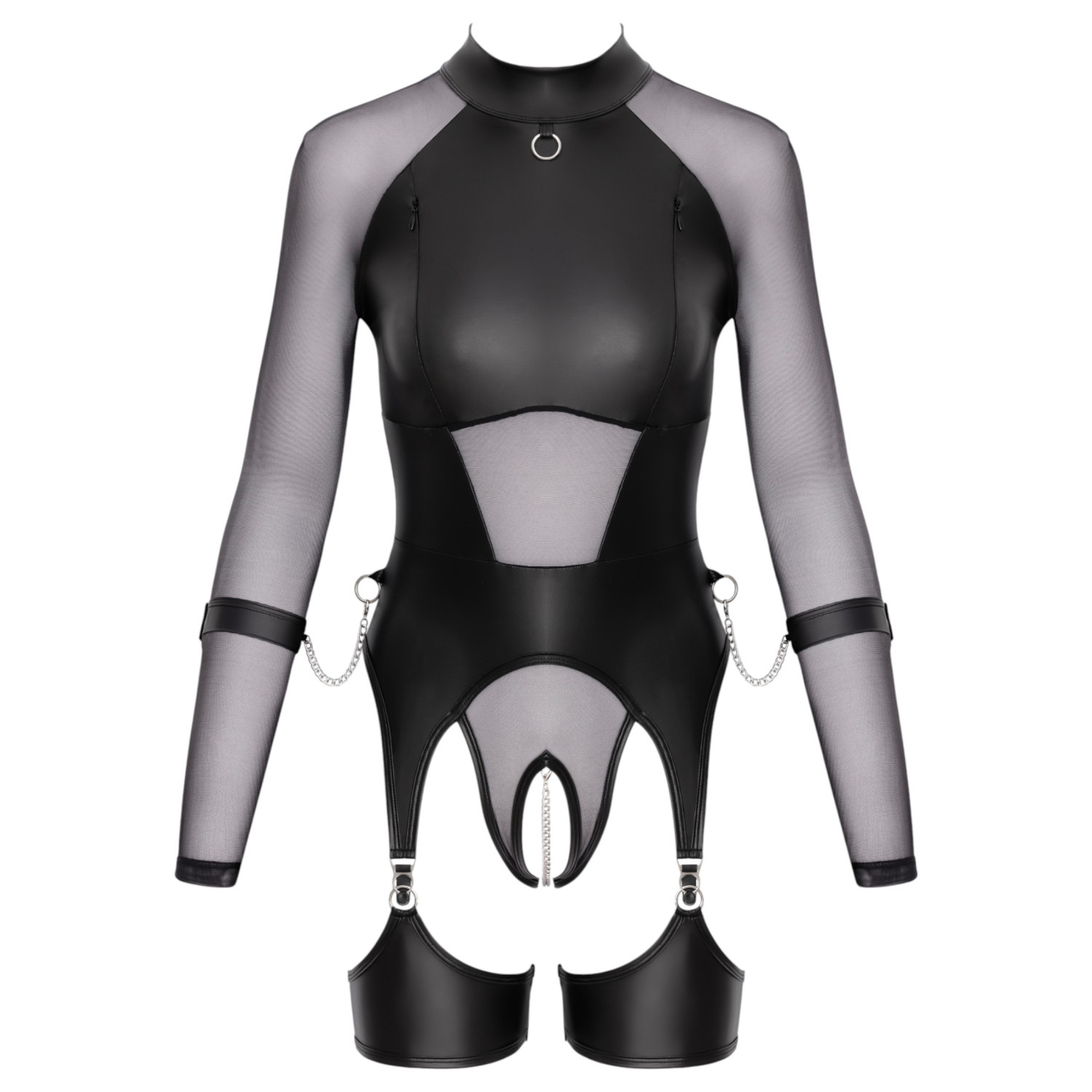 Cottelli Bondage gjennomsiktig, skinnende topp er den perfekte kombinasjonen av dristig erotikk og elegant design. Den tettsittende, langermede bodyen er laget av en kombinasjon av gjennomsiktige og matte materialer som er både elegante og provoserende. Den avtagbare kjeden over det intime området, de avtagbare lårbåndene, og de skjulte glidelåsene ved brystet garanterer spenning. Settet inkluderer myke håndjern som kan festes til ringene på sidene av kroppen, noe som gir en virkelig allsidig og fantasifull lekeopplevelse.