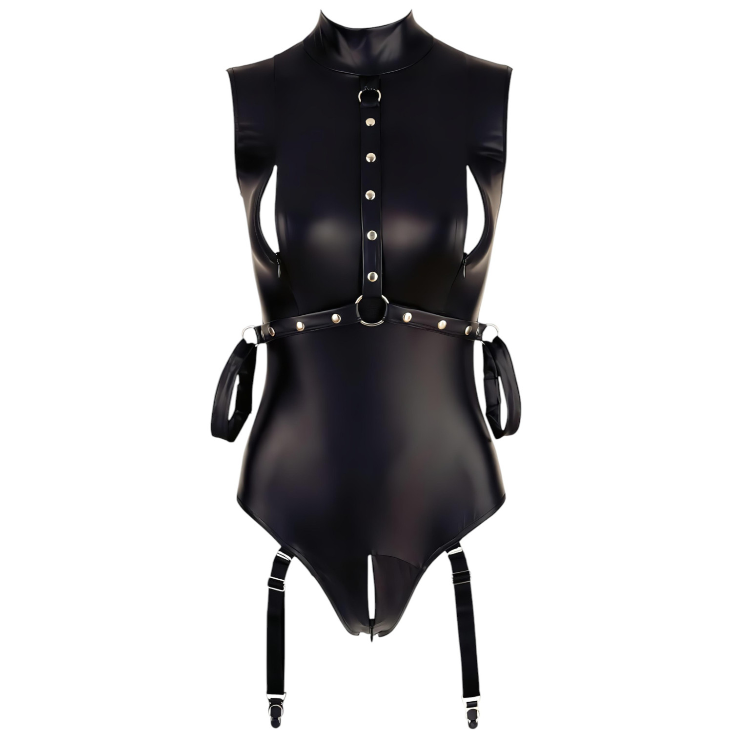 Opplev en ny dimensjon av lidenskap og forførelse med denne fortryllende bodysuiten med strømpeholdere og innebygde håndlenker, som gir en fengslende opplevelse!