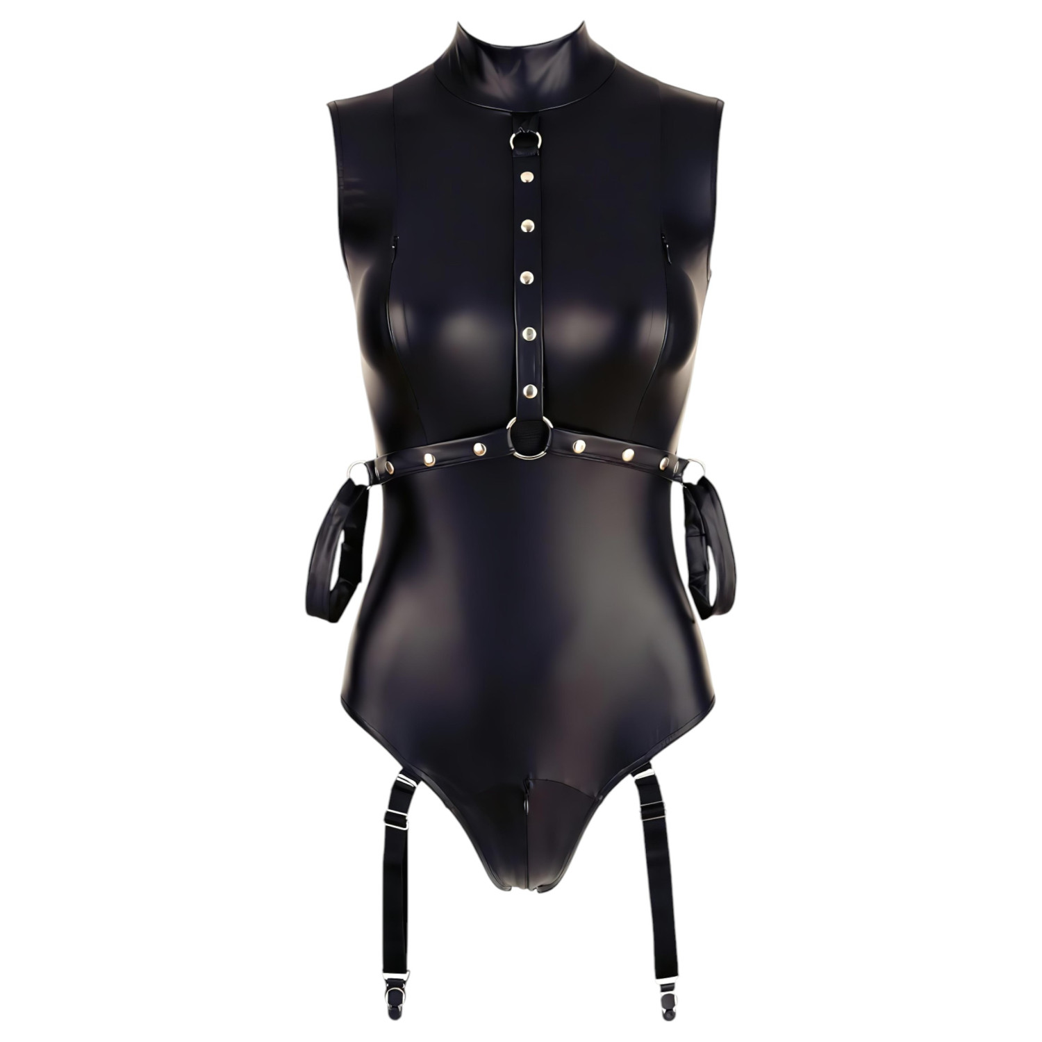 • 1 skinnende, læraktig bodysuit med strømpeholdere og innebygde håndlenker