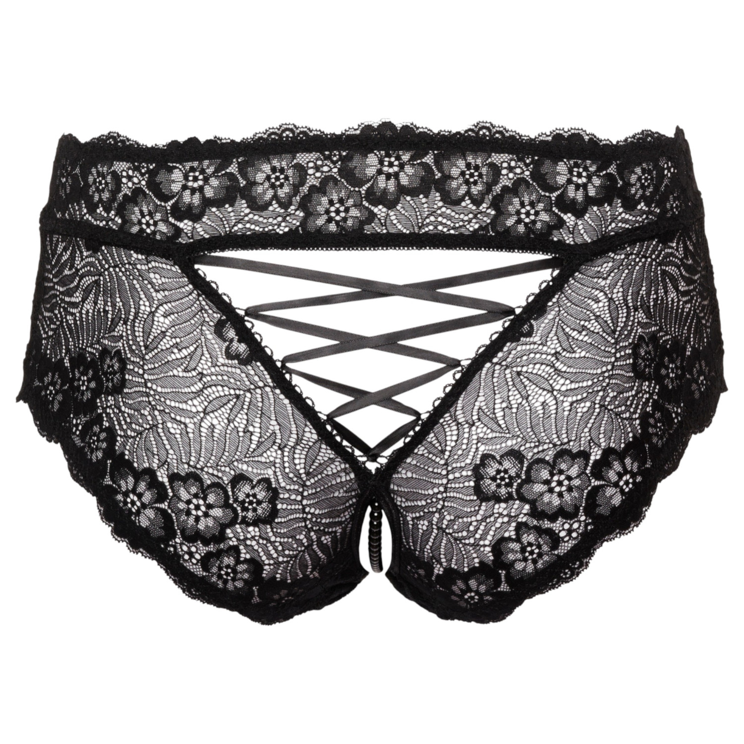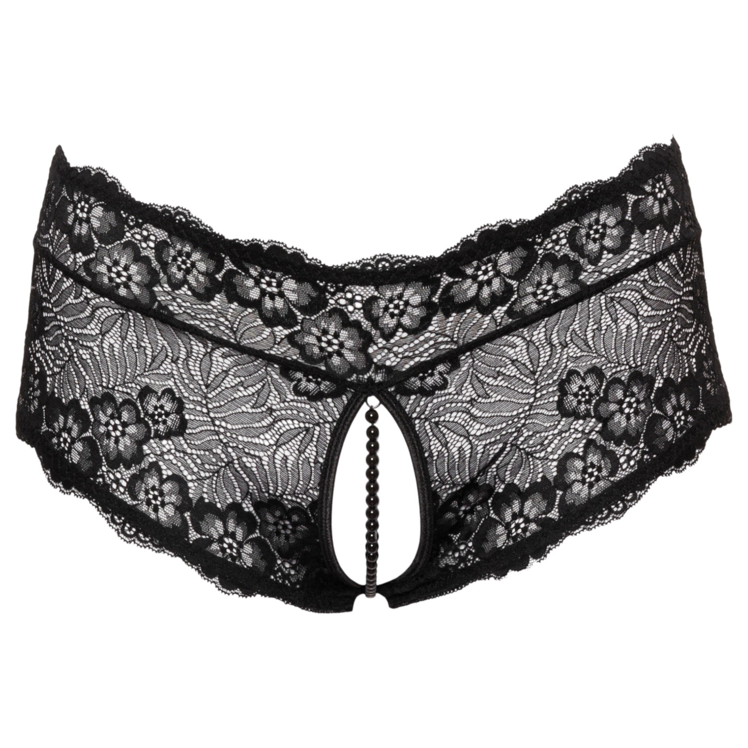 Cottelli Curves - åpen blondeunderbukse (svart) er en utrolig forførende underbukse laget av delikate blonder med blomsterdesign. Den åpne utformingen og den stimulerende perlekjeden skaper umiddelbart en spennende atmosfære.
