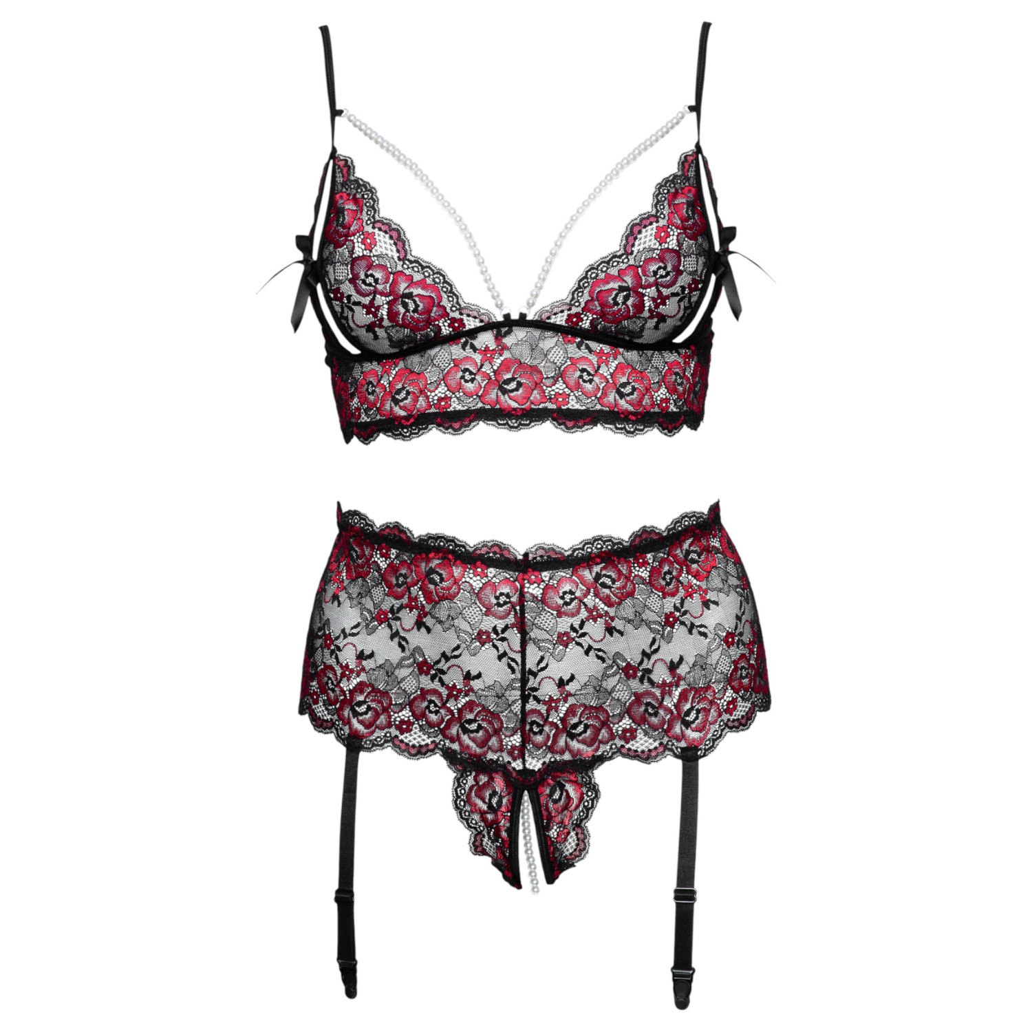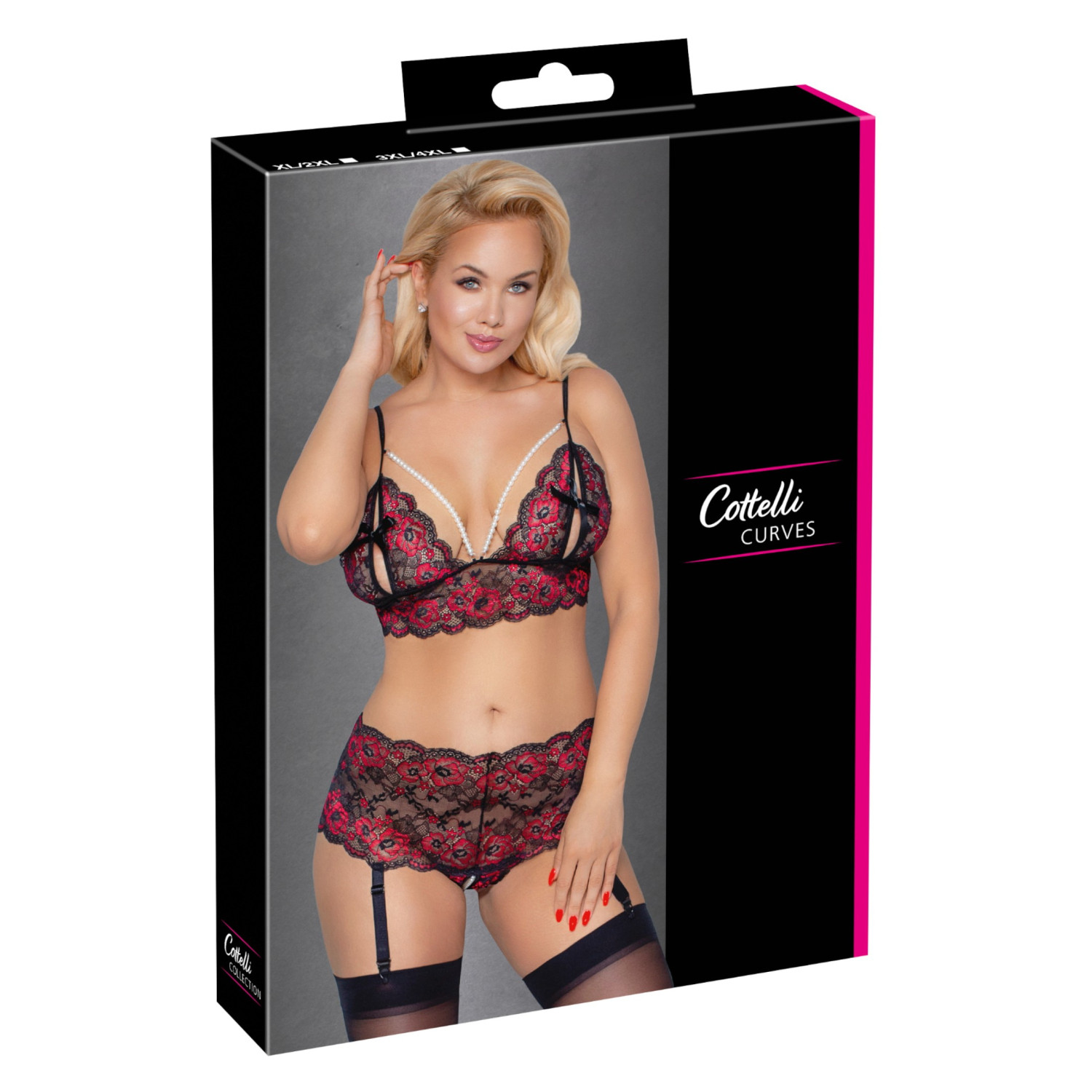 Cottelli Curves perlebrodert blondesett er det ideelle valget hvis du ønsker et undertøy som er romantisk, ekstremt sexy og behagelig på samme tid. Den trådløse bh-en lokker med perlesmykkede åpne kopper holdt sammen av små sløyfer. Den høye midjetrusen i blonder blir virkelig spennende med perlekjeden over den crotchless designen. Settet er laget i sin helhet av myke, elastiske blonder, og gir dermed en utmerket kombinasjon av visuell tiltrekning og brukskomfort.