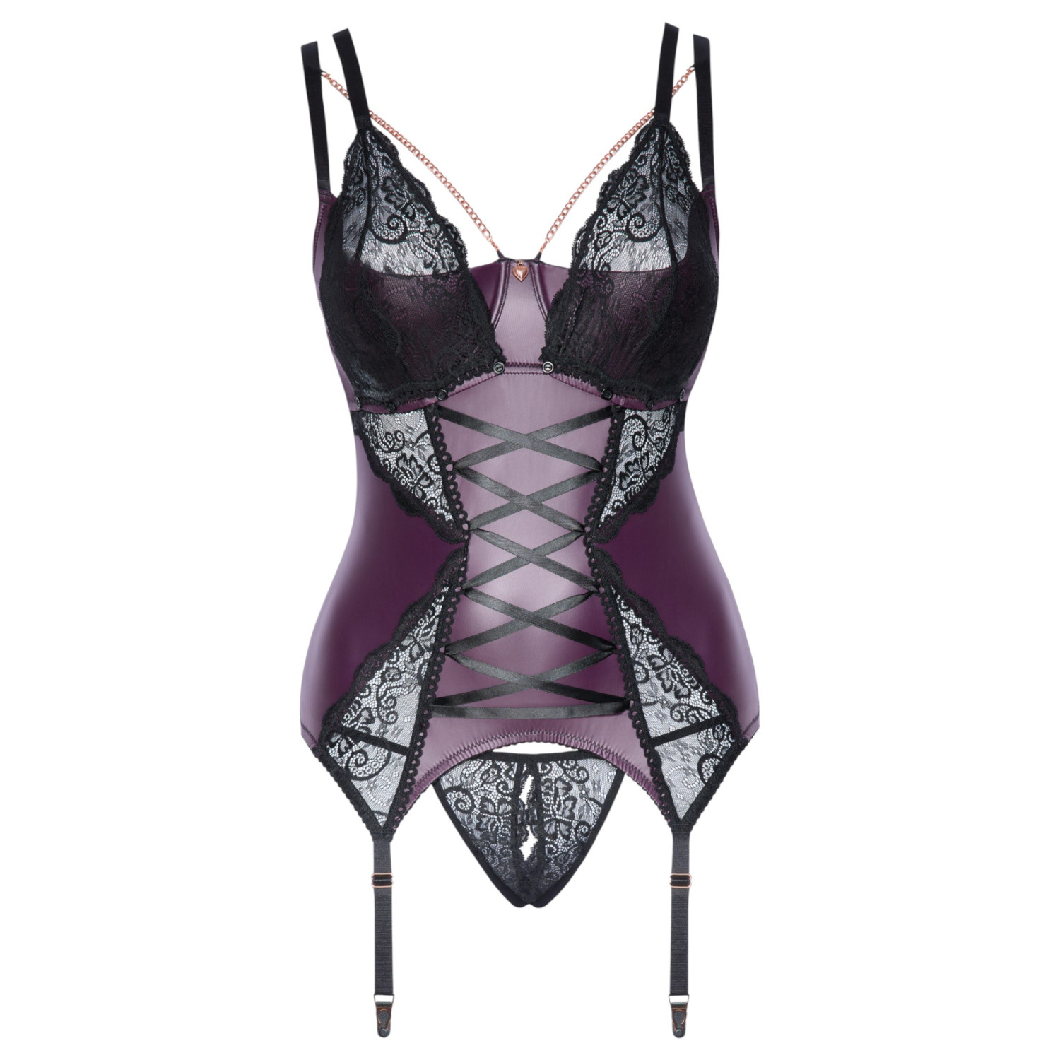 Cottelli Curves - blonde, korsett undertøysett (lilla) med sensuelle detaljer, forførende blonder og frekk, åpen truse, tilbyr den mest sexy formen for selvsikker, feminin stil.