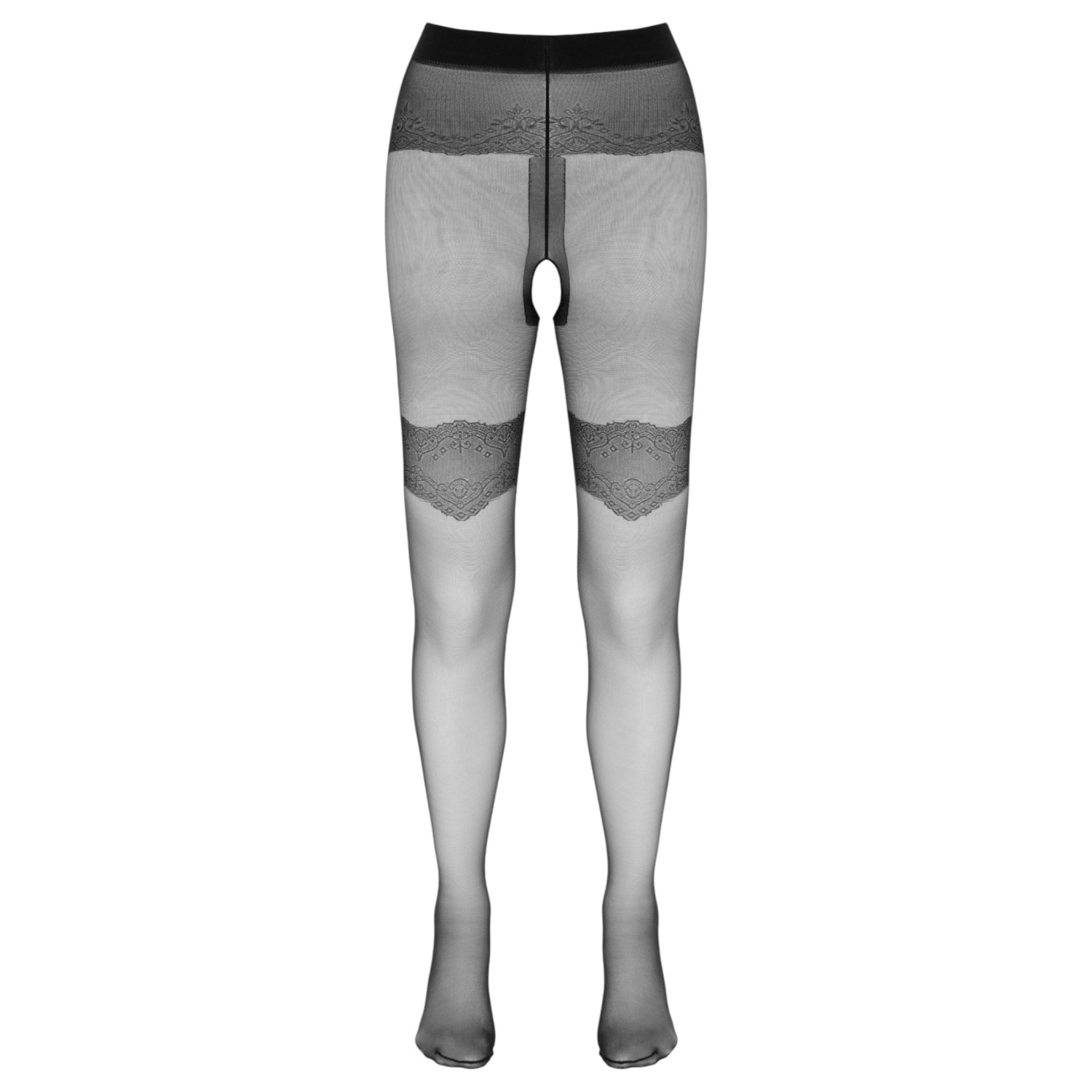 Disse forførende strømpene er det perfekte valget for de som ønsker et elegant, men sensuelt utseende. Den spesielle strømpebåndseffekt-konstruksjonen gir et unikt visuelt inntrykk, mens det elastiske, materialet av høy kvalitet sikrer komfort. Den åpne stilen foran gjør den perfekt for date-nights og kan til og med bæres komfortabelt under akten.