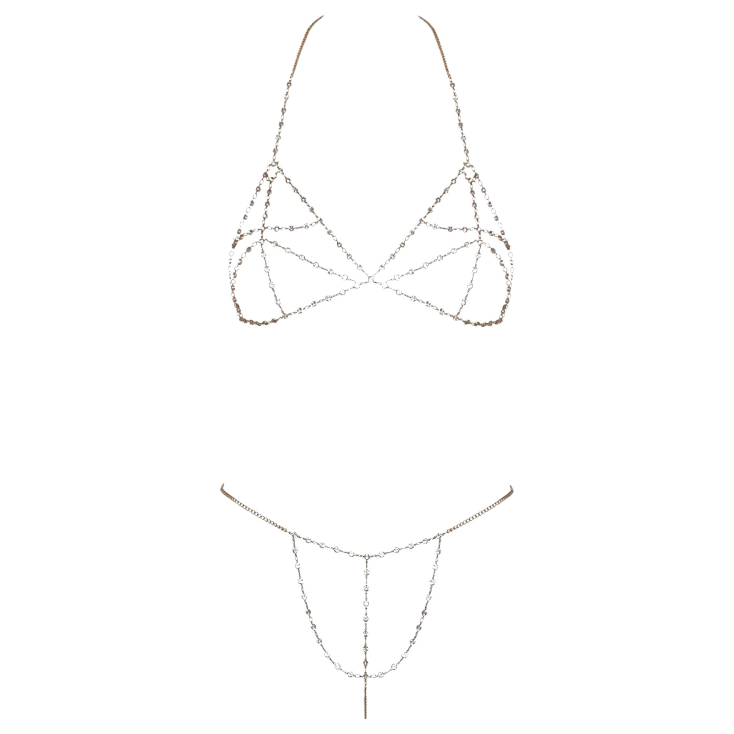 • De sensuelle, glitrende strasskjedene løper langs brystene og de intime områdene, og øker den erotiske effekten
