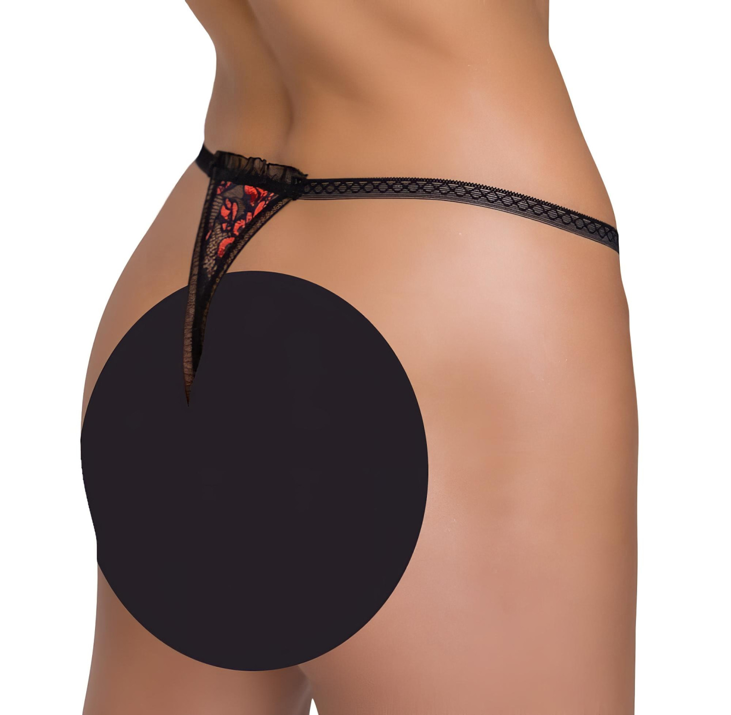 Utforsk en ny dimensjon av sensualitet med denne delikate, gjennomsiktige blonde-thongen, pyntet med glitrende detaljer og rosedekor i silkeaktig broderi!