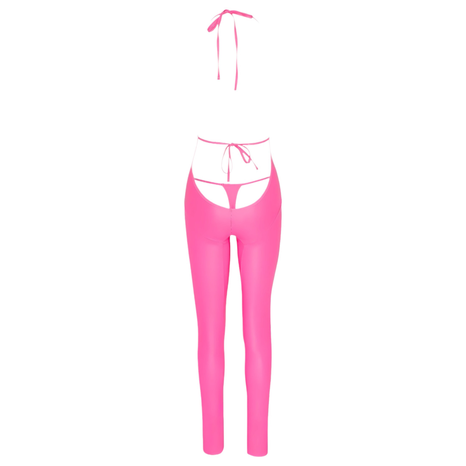 Ekstra dyp ryggdesign, spesiallaget, skinnende overall, som pryder ryggen med den tilhørende stringtrusen og fremhever linjene.