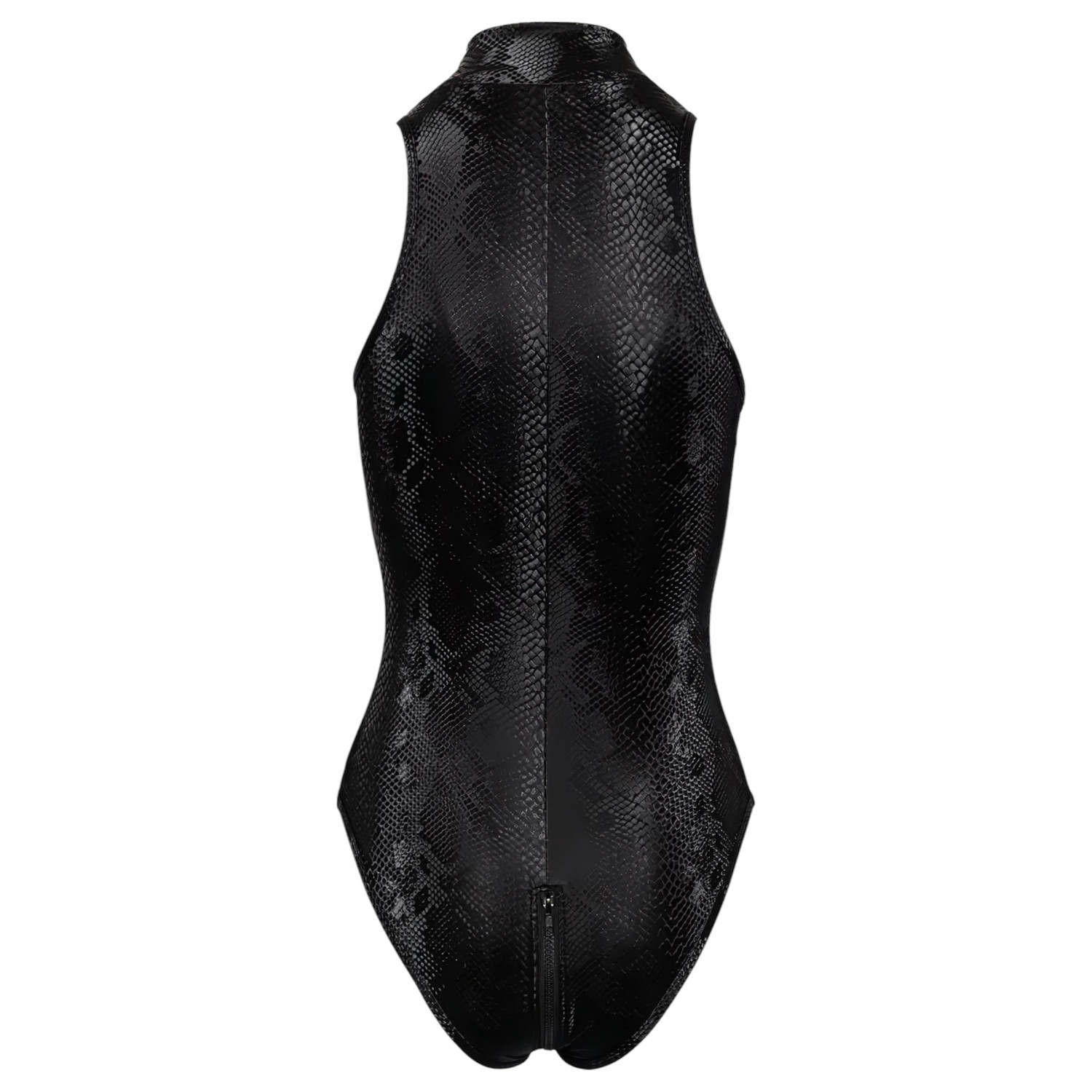 Ormenskinnmønstret body med forhøyet halsdel, toveis glidelås fra krage helt til baken! Med sitt silkeglansede ormeskinnmønster vil du bli forførende mystisk!