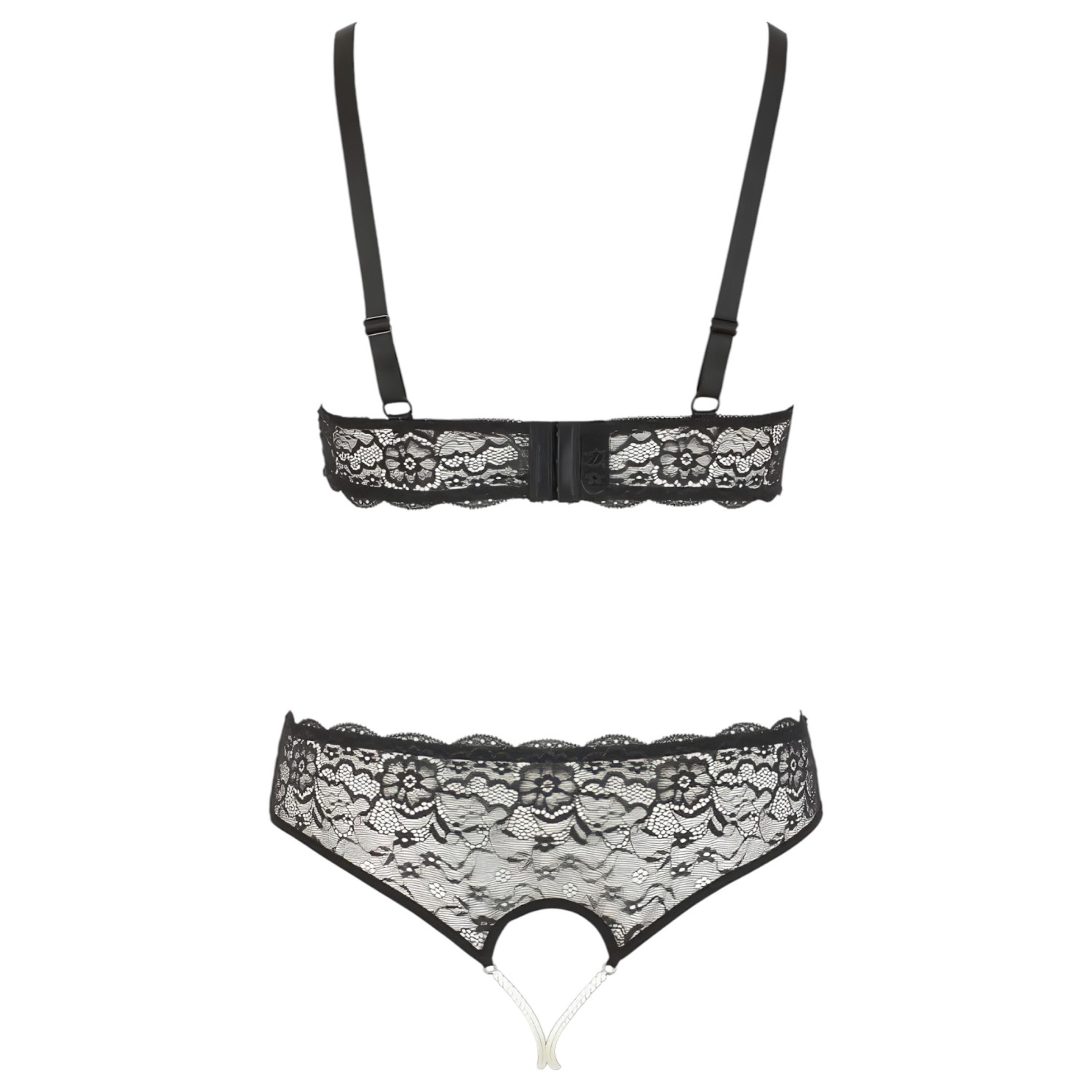 Drømmende vakkert og nøye utformet sett laget av myk, blomsterdekorert svart blonde, med sensuelle hvite perler.