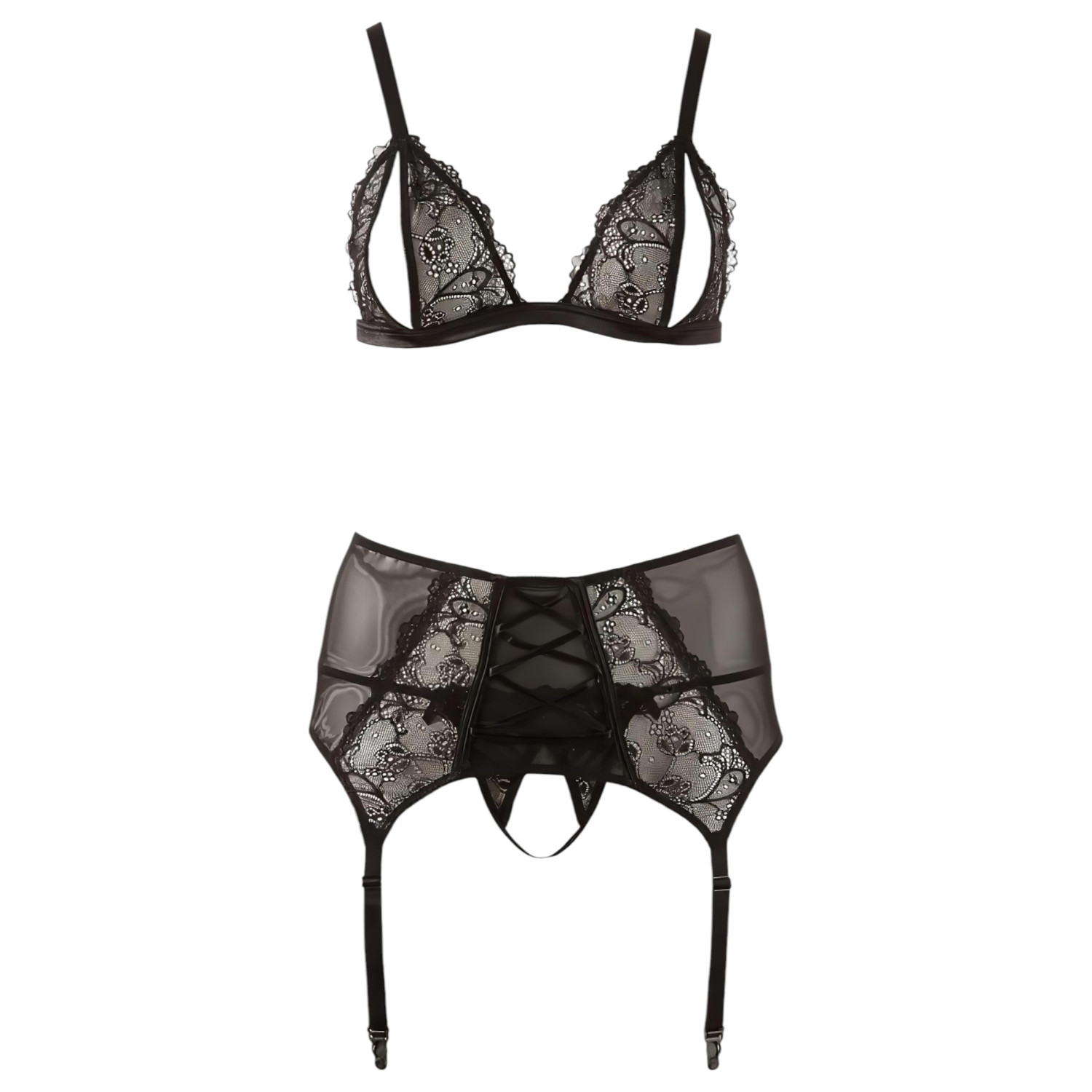 • Forførende design: Åpen bh som etterlater brystene fri og strømpeholder med satin snøring foran forsterker det sensuelle utseendet.