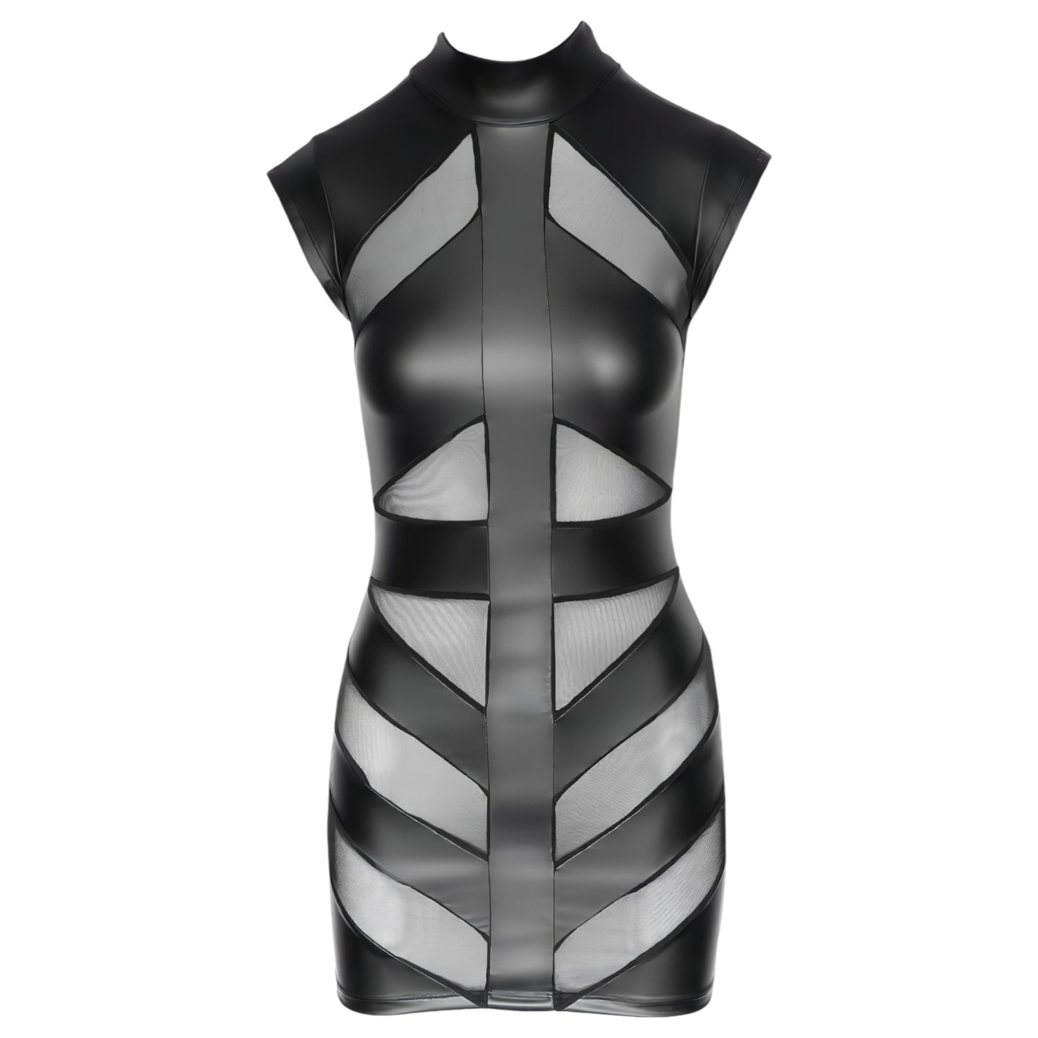 Ermeløs, skinnende svart kjole med gjennomsiktige nettingstriper, som du kan bruke på soverommet, eller (hvis du er virkelig modig) på en vill fest også.