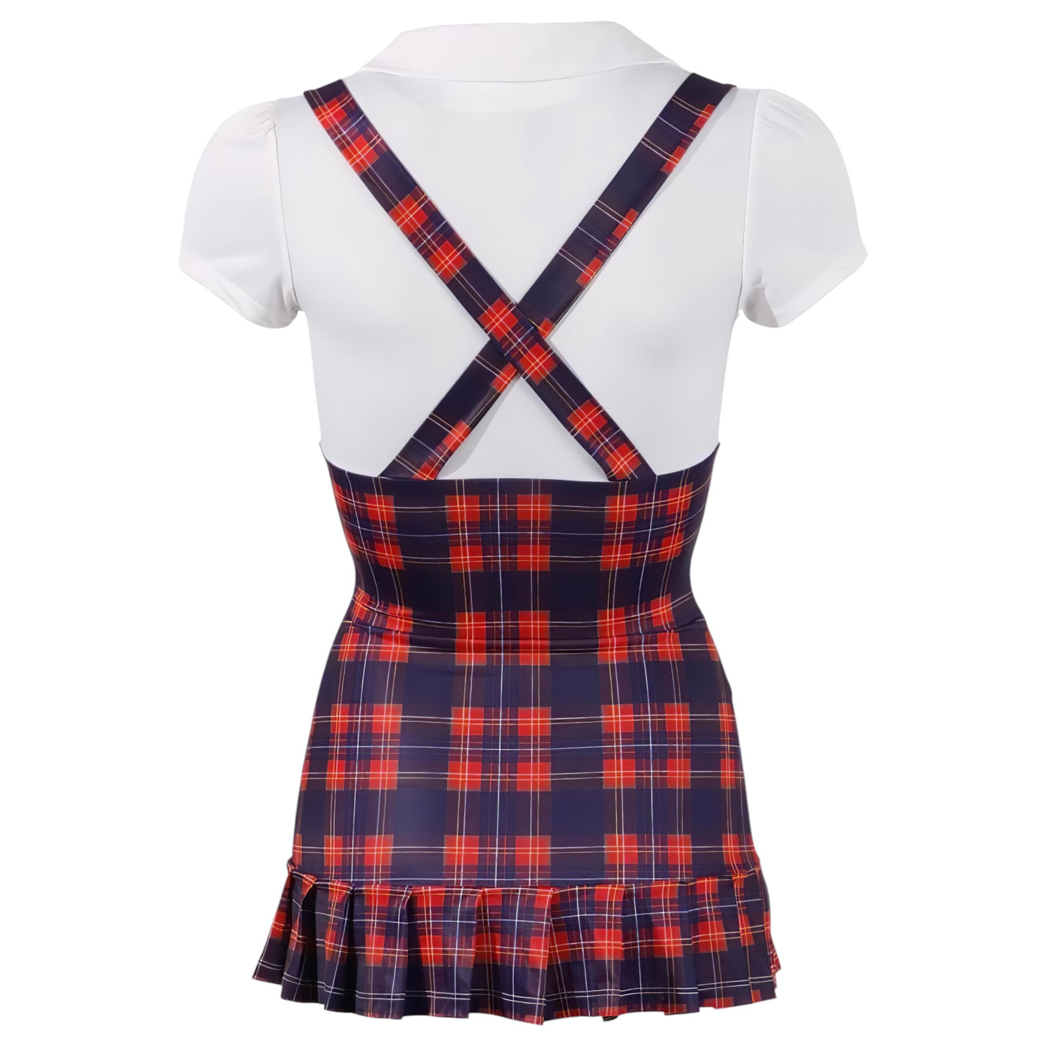 • 1 stk. skoleinspirert kostyme (bluse og skjørt sett med innebygde stropper og sløyfer)