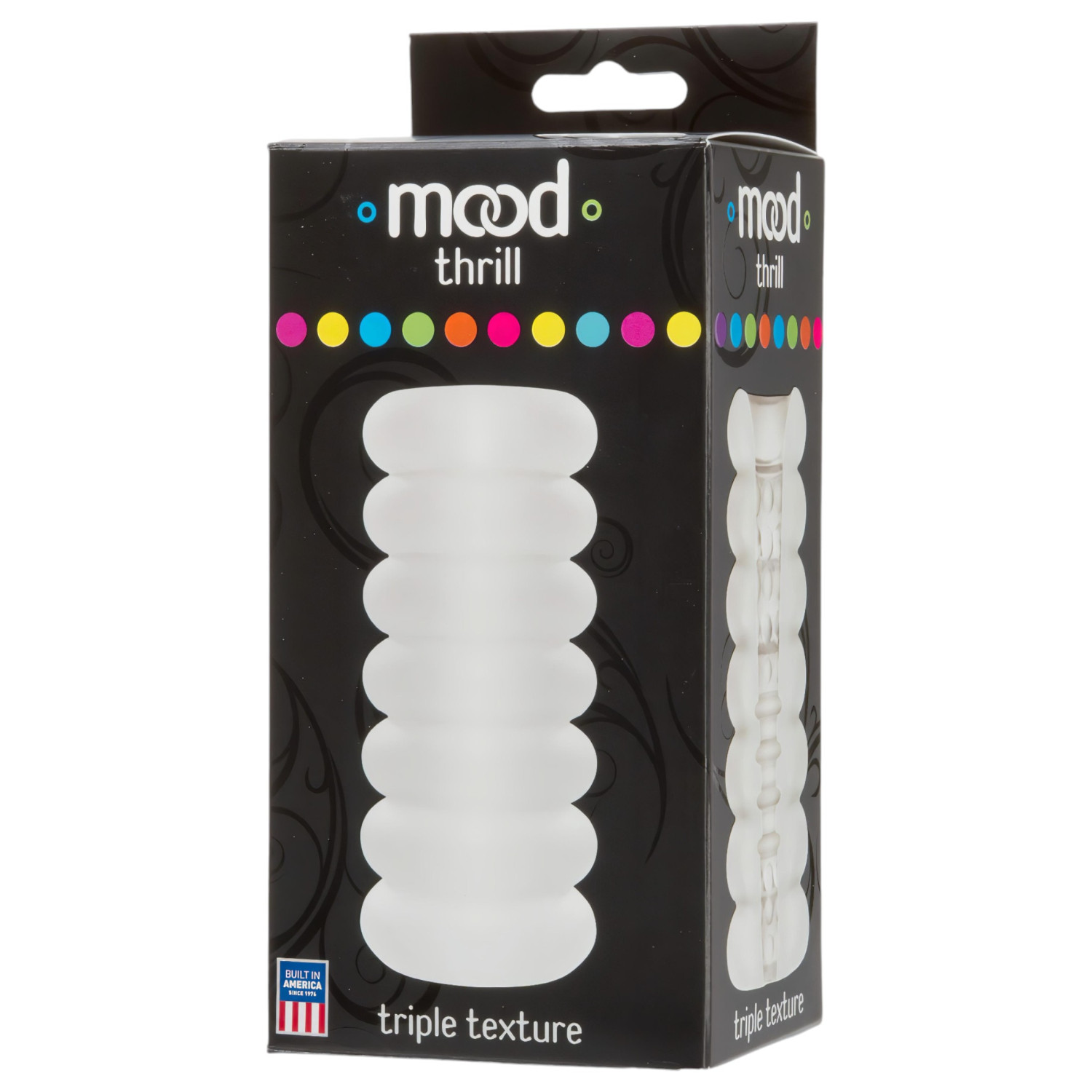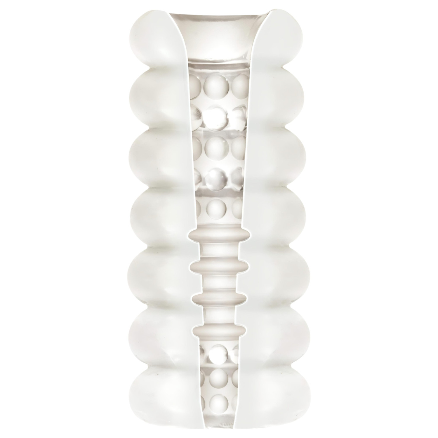 • Tre forskjellige indre teksturer - store, myke massasjeperler ved inngangen, ribbet i midten, og mindre, strammende massasjeperler i enden