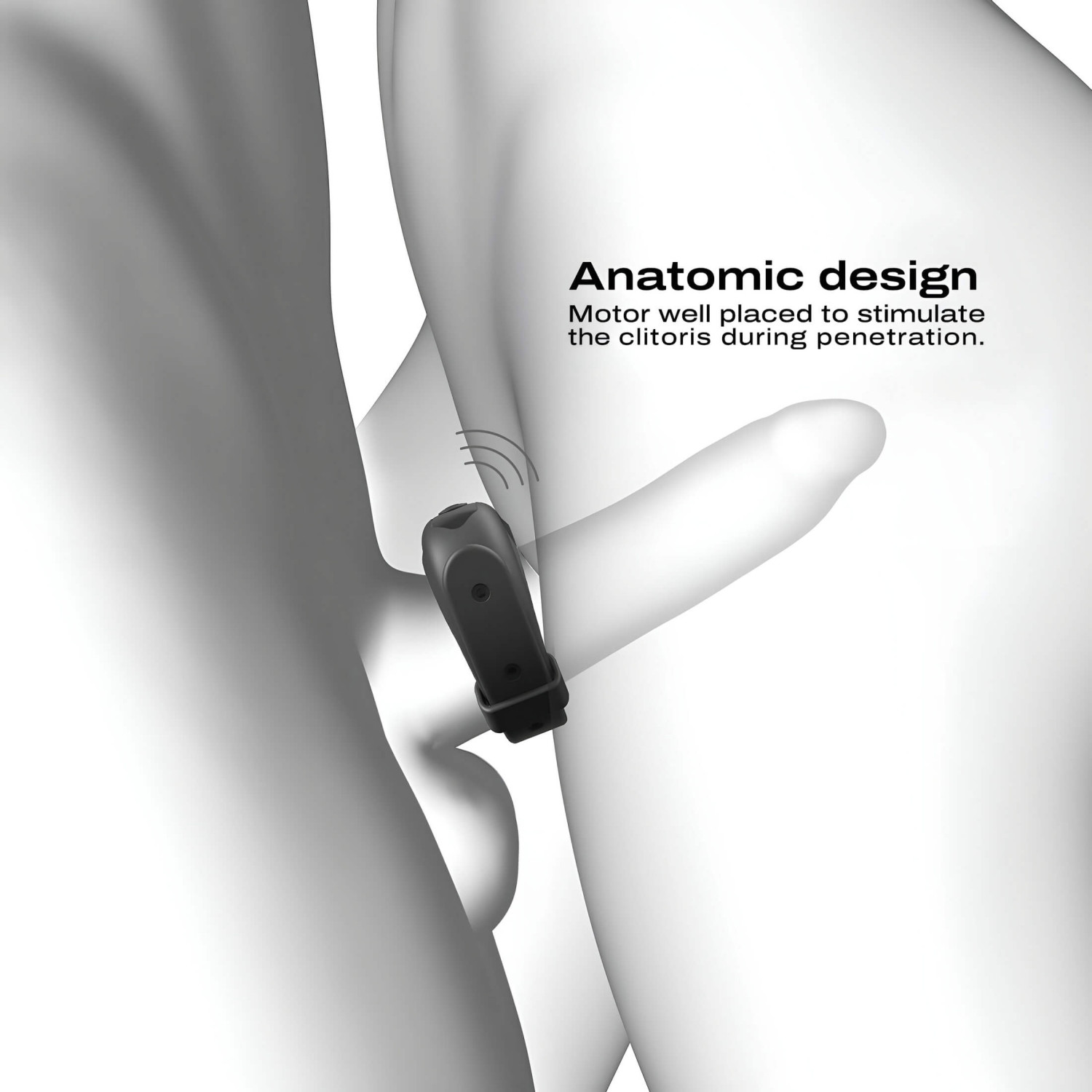 Plasser ringen ved roten av penis, og juster stroppen slik at den sitter komfortabelt rundt penis og testikler. Du kan også stimulere klitoris under akten ved å posisjonere den vibrerende delen.