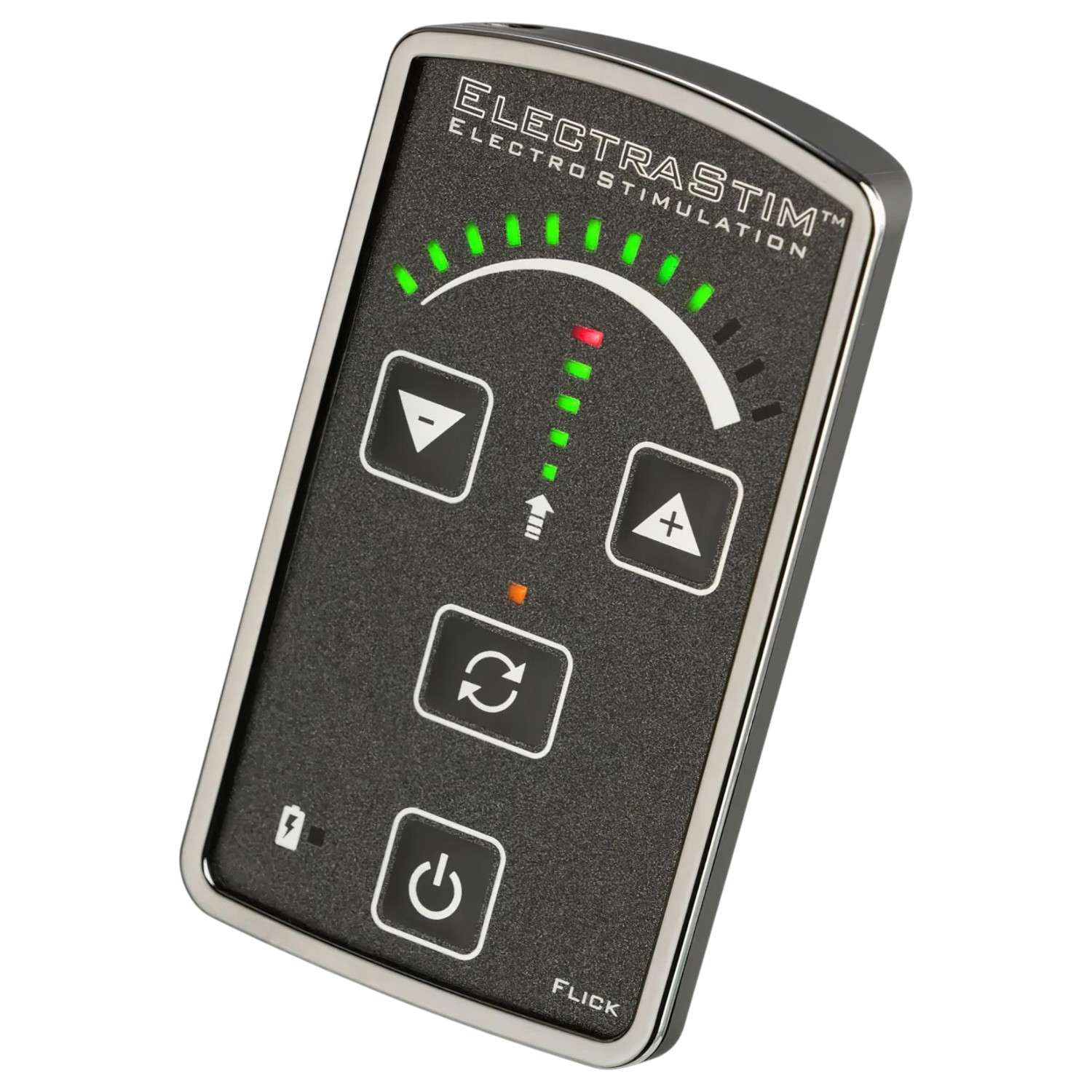 ElectraStim Flick er en ergonomisk stimulator med LED-display, og har en spesiell Flick-modus. Denne funksjonen lar deg styre impulsene med håndleddsbevegelser, slik at hver økt blir helt personlig tilpasset. Enheten har 7 stimuleringmønstre og 24 intensitetsnivåer, så du kan oppleve alt fra lett kribling til intens pulsering. Settet er for de som ønsker å utvide sine muligheter innen elektrosex-verdenen, enten det er til onani, forspill eller som et supplement under akten.