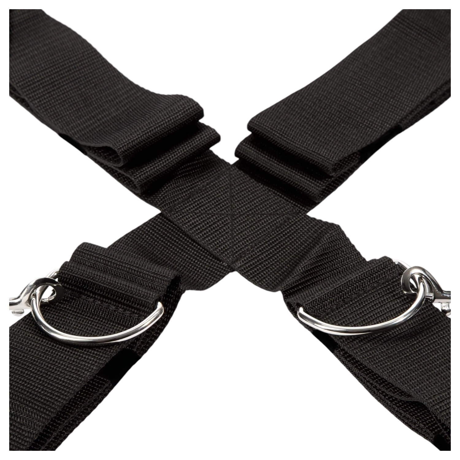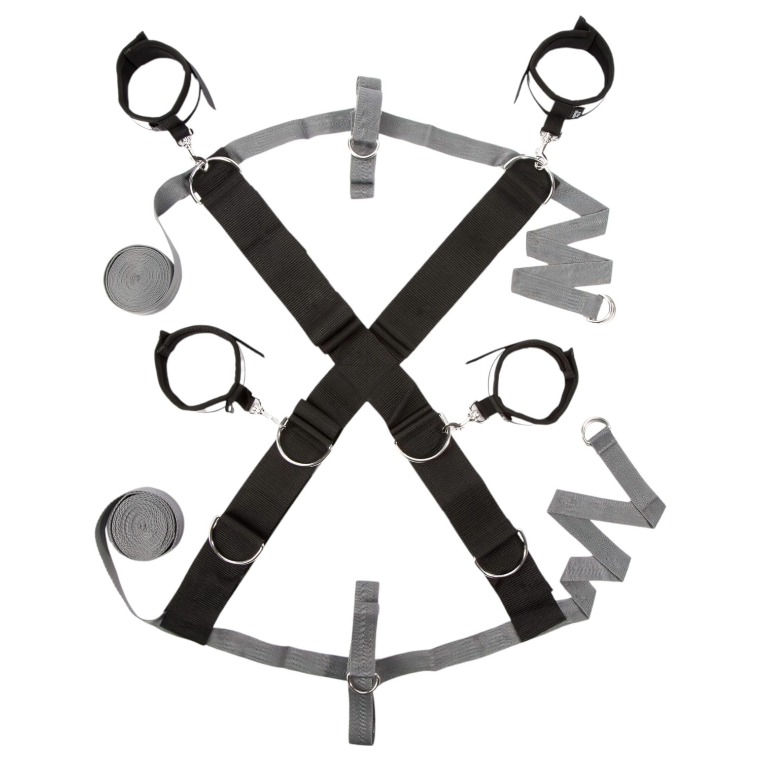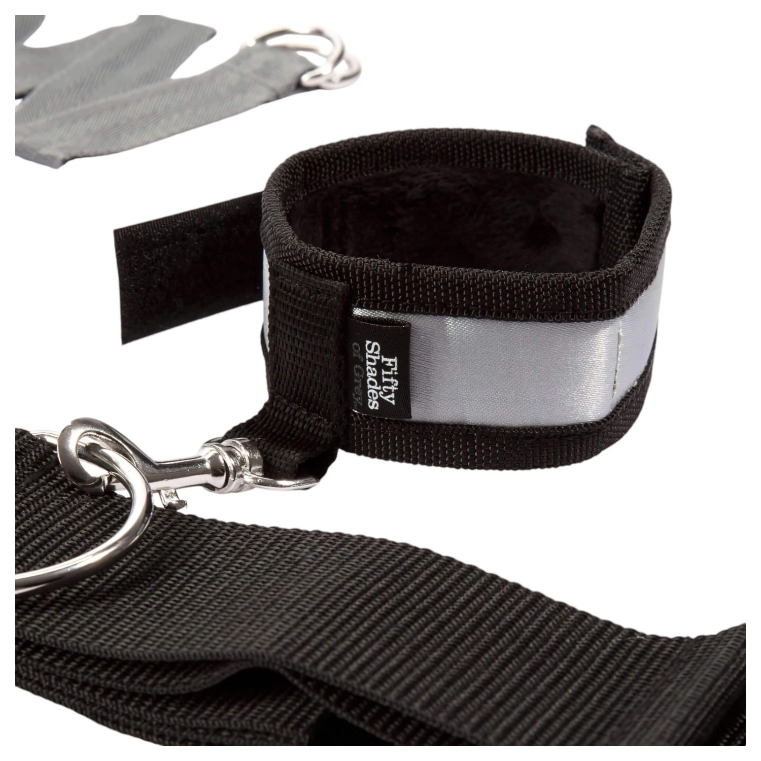 Plasser tverrbåndet under sengen, og fest de grå lange stroppene i riktig posisjon. Justér håndledd- og ankelmansjettene med borrelås, og fest dem med de små karabinkrokene. Bruk en øyebind for å forsterke sansene, og nyt en helt ny opplevelse.