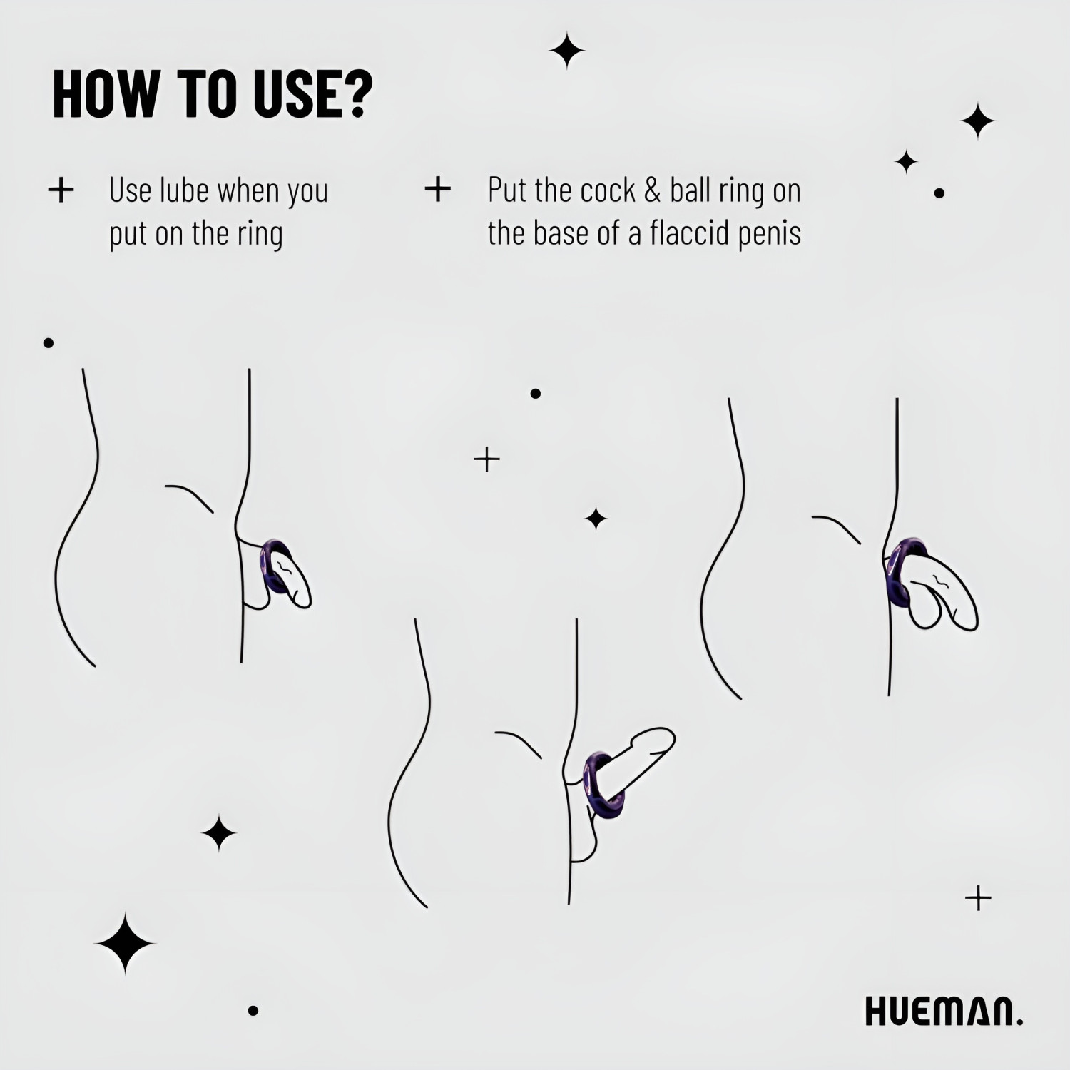 Påfør glidemiddel på ringen, og eventuelt på penis. Ringen plasseres ved roten på penis i stiv eller halvstiv tilstand. For mindre til normal penis, plasser både penis og testiklene inni samtidig.