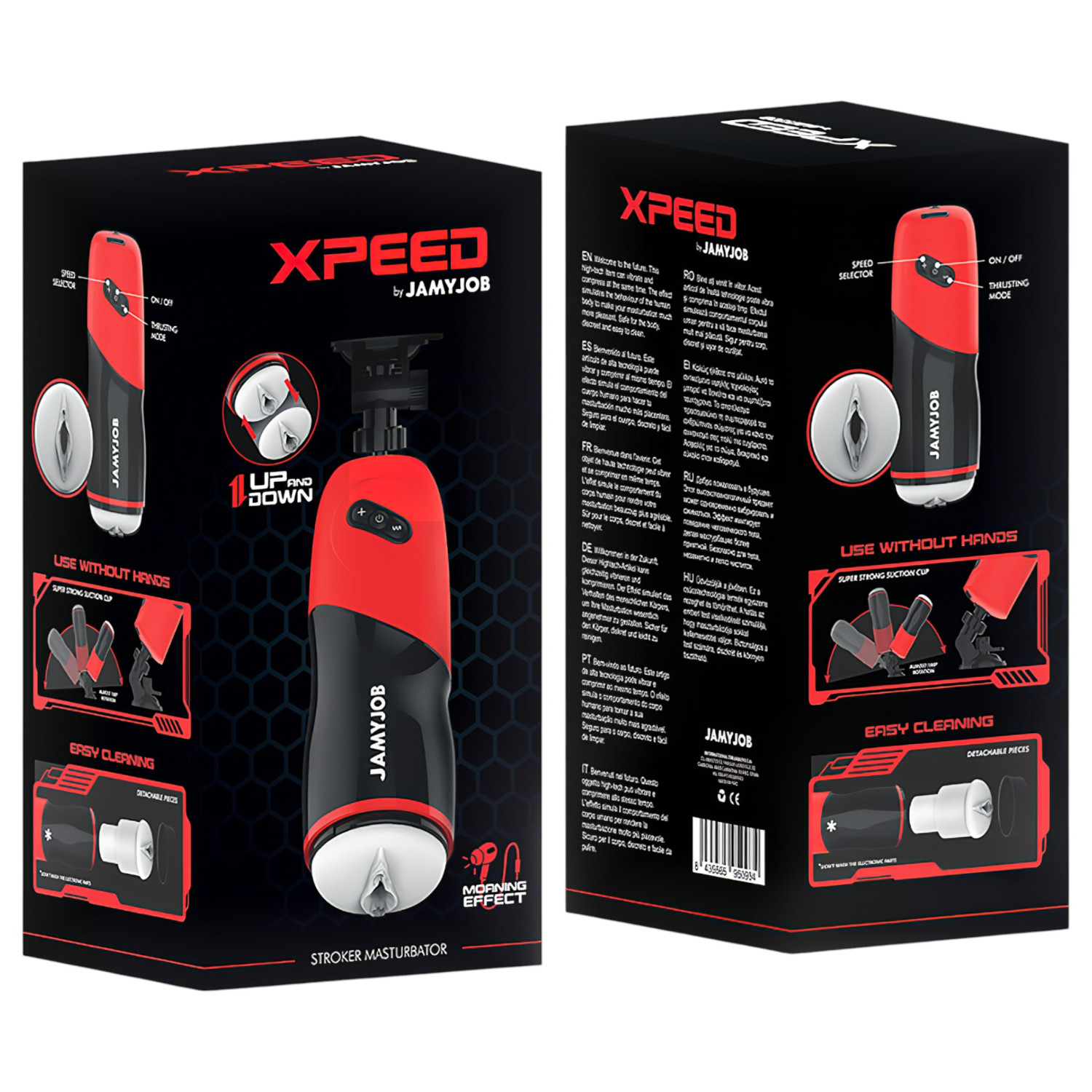 JamyJob XPEED er en av de mest innovative mannlige masturbatorene på markedet, som kombinerer realistiske bevegelser, kraftige støt og realistiske lydeffekter i et elegant, sort-rødt design. Den myke, gjennomsiktige medisinske silikon-innsatsen gir en komfortabel passform, mens 5 ulike støtrytmer og justerbar intensitet gir deg full kontroll. Den USB-oppladbare motoren sikrer langvarig ytelse, og det vannavstøtende designet gjør rengjøring og bruk på badet enkelt.