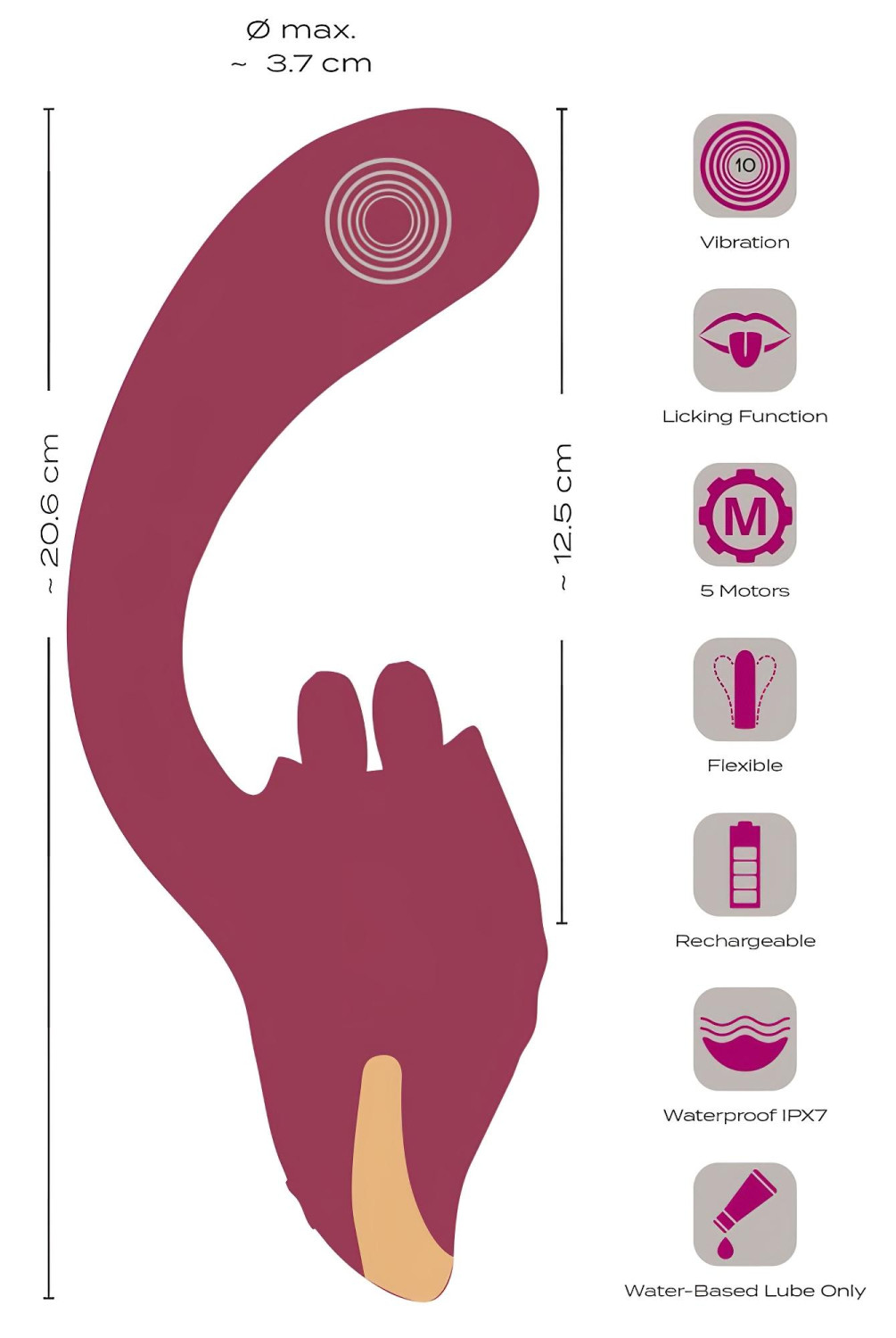 • Kraftige og varierte vibrasjonsmoduser - 10 vibrasjonsmoduser i den bøyde stammen og 10 klitorisstimulerende moduser i de fleksible doble tunger