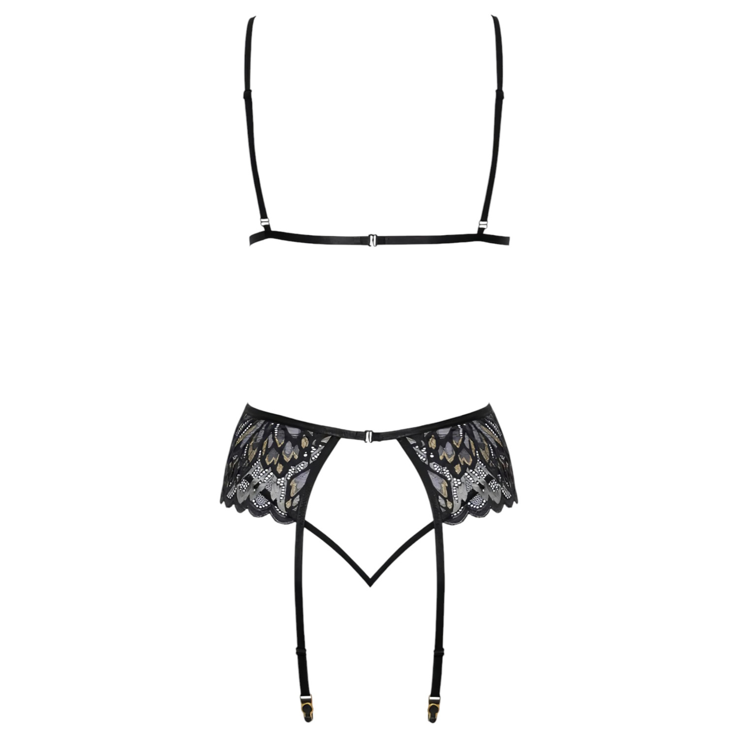 Sensuelt undertøysett med delikate detaljer, prydet med silkeglinsende broderier i gull og sølv.