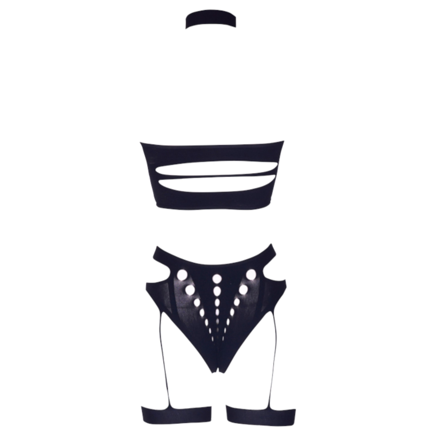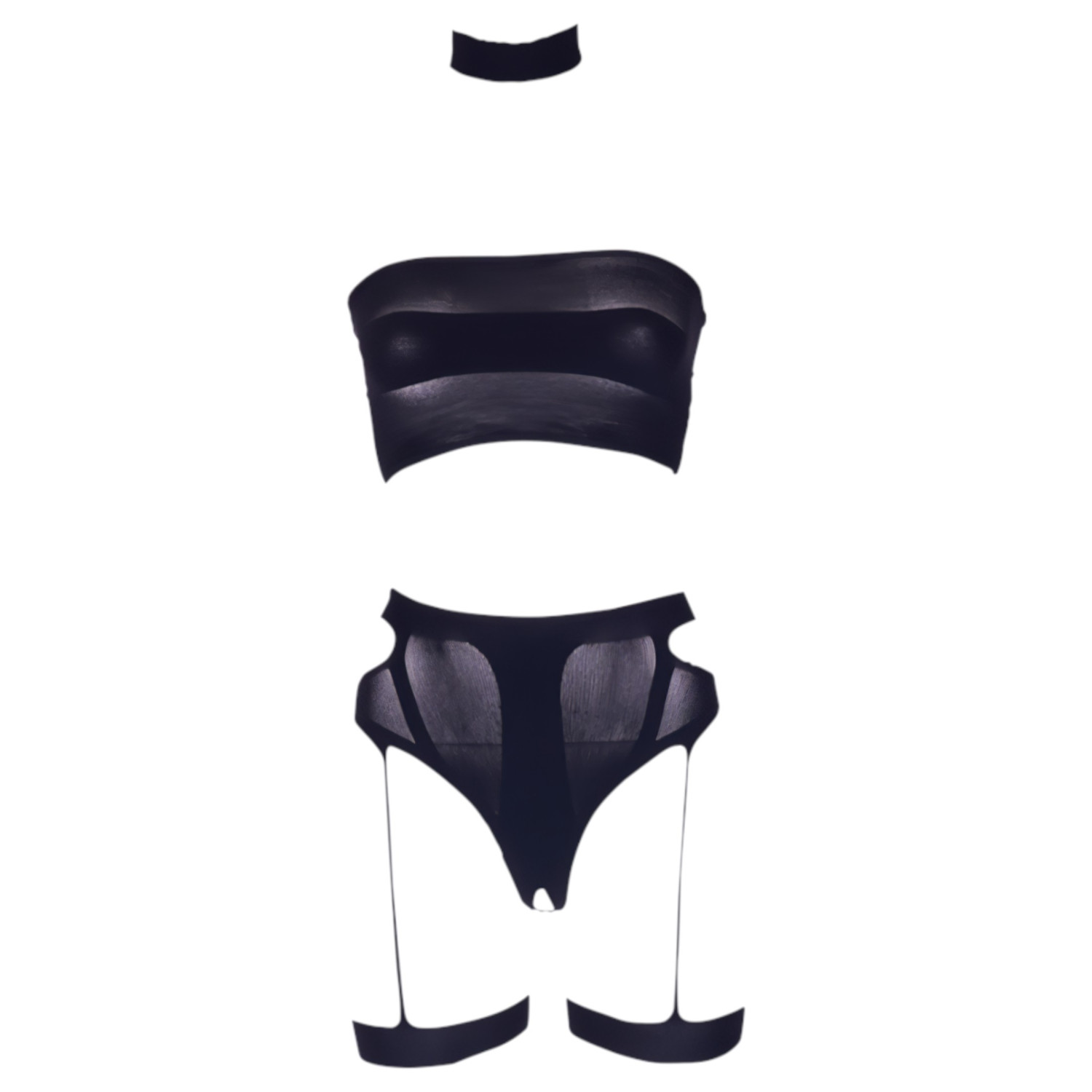 • 3-delt sett - inkluderer truse med strømpeholder, stroppeløs bandeau-topp og en halsbånd