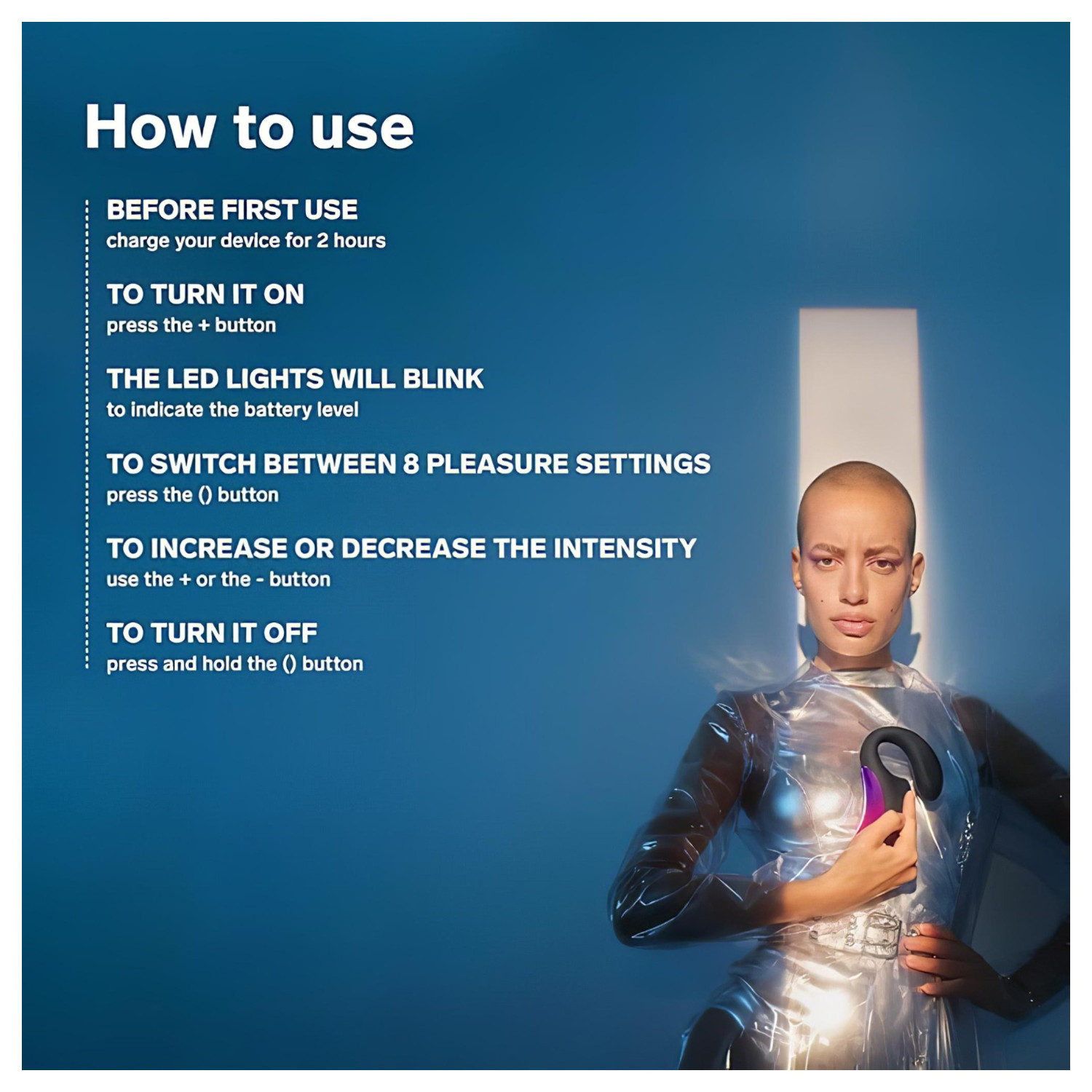 Påfør glidemiddel på vibratoren, og plasser den i skjeden slik at den kortere armen hviler mot klitoris. Justér forsiktig sugekoppen for optimal passform, og nyt hvordan soniske impulser og dype vibrasjoner harmonerer for å gi nytelse. Bytt vibrasjonsmodus og intensitet etter behov med knappene.