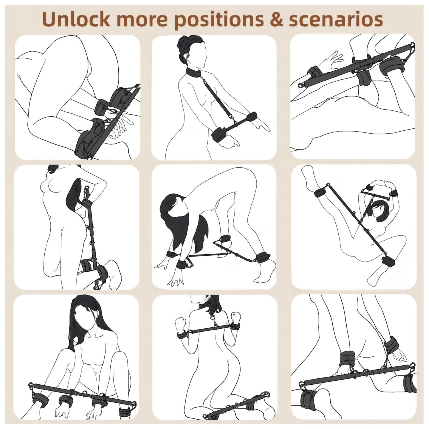Spredestang BDSM-bindesettet er det perfekte valget hvis du ønsker å kontrollere partnerens bevegelser mens dere komfortabelt og trygt nyter underkastelsens gleder. Kombinasjonen av justerbare stenger og myke nylonstropper gir maksimal stabilitet og komfort, selv for de mest spennende rollespillene.