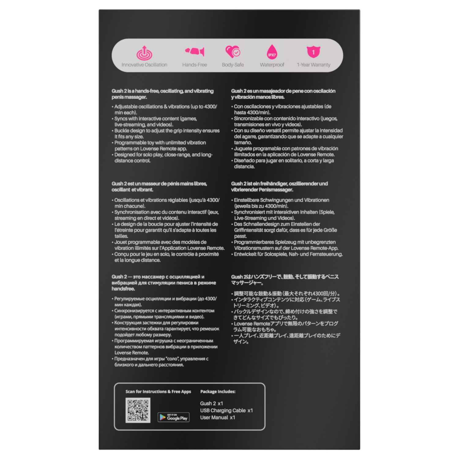 • Fleksibelt og justerbart design: Gush 2 tilpasser seg forskjellige størrelser og preferanser, slik at du kan bruke den håndfritt eller med manuell kontroll for mer intens stimulering.